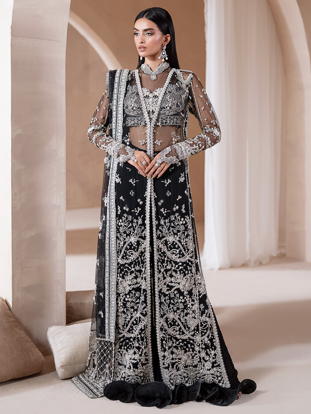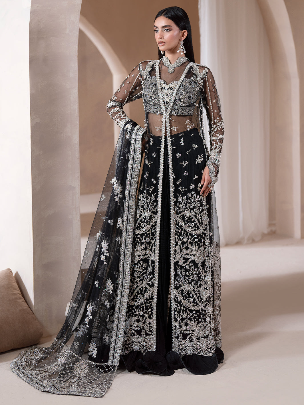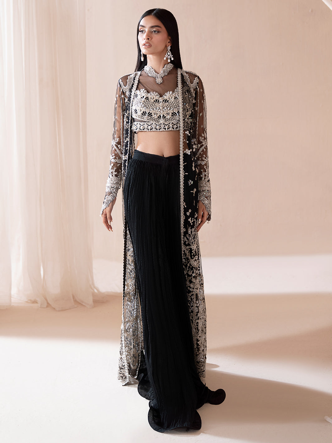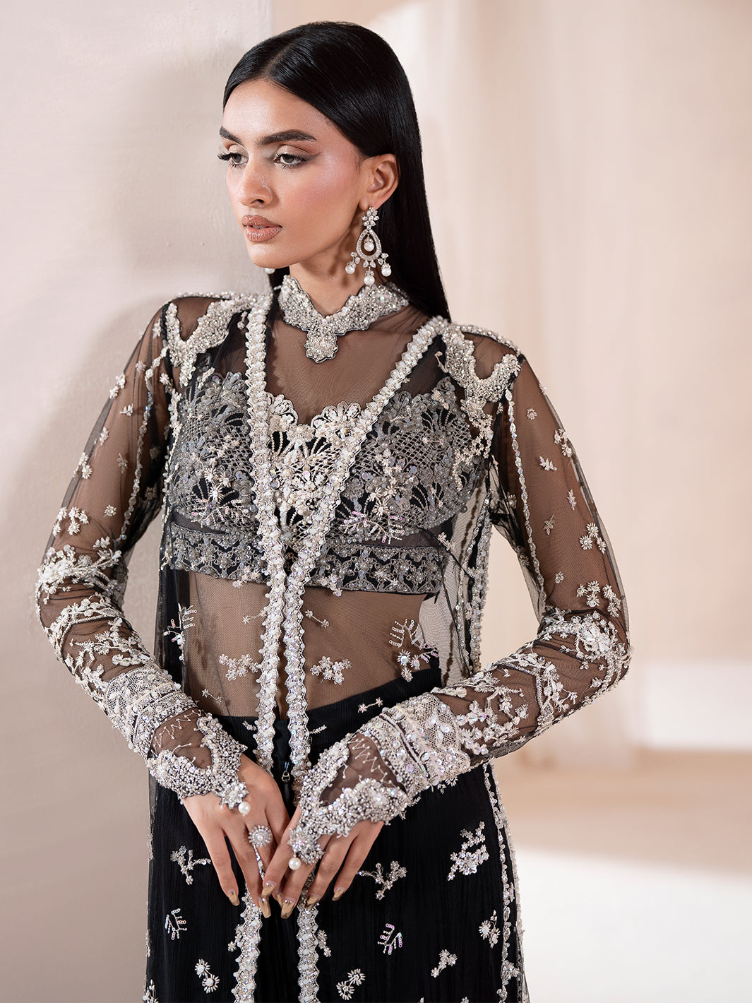 Ardeur the deep allure of black emerges bold, magnetic, and breathtakingly refined. The front-open jacket with a side slit unveils an intricately embellished inner tube blouse, adorned with pearls, crystals, sequins, and cut dana, framing a uniquely detailed neckline. Paired with a flowing crushed sharara and a diaphanous dupatta, the ensemble captures both grace and grandeur. Embellished with threadwork, tilla, batki, pearls, crystals, and sequins, it mirrors the shimmer of starlit nights. A masterpiece of contrast and charisma,Ardeur is strength woven into elegance an ode to the power of poise.