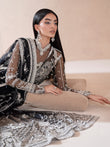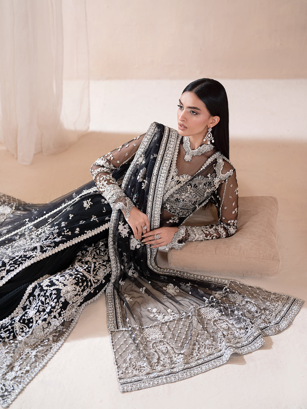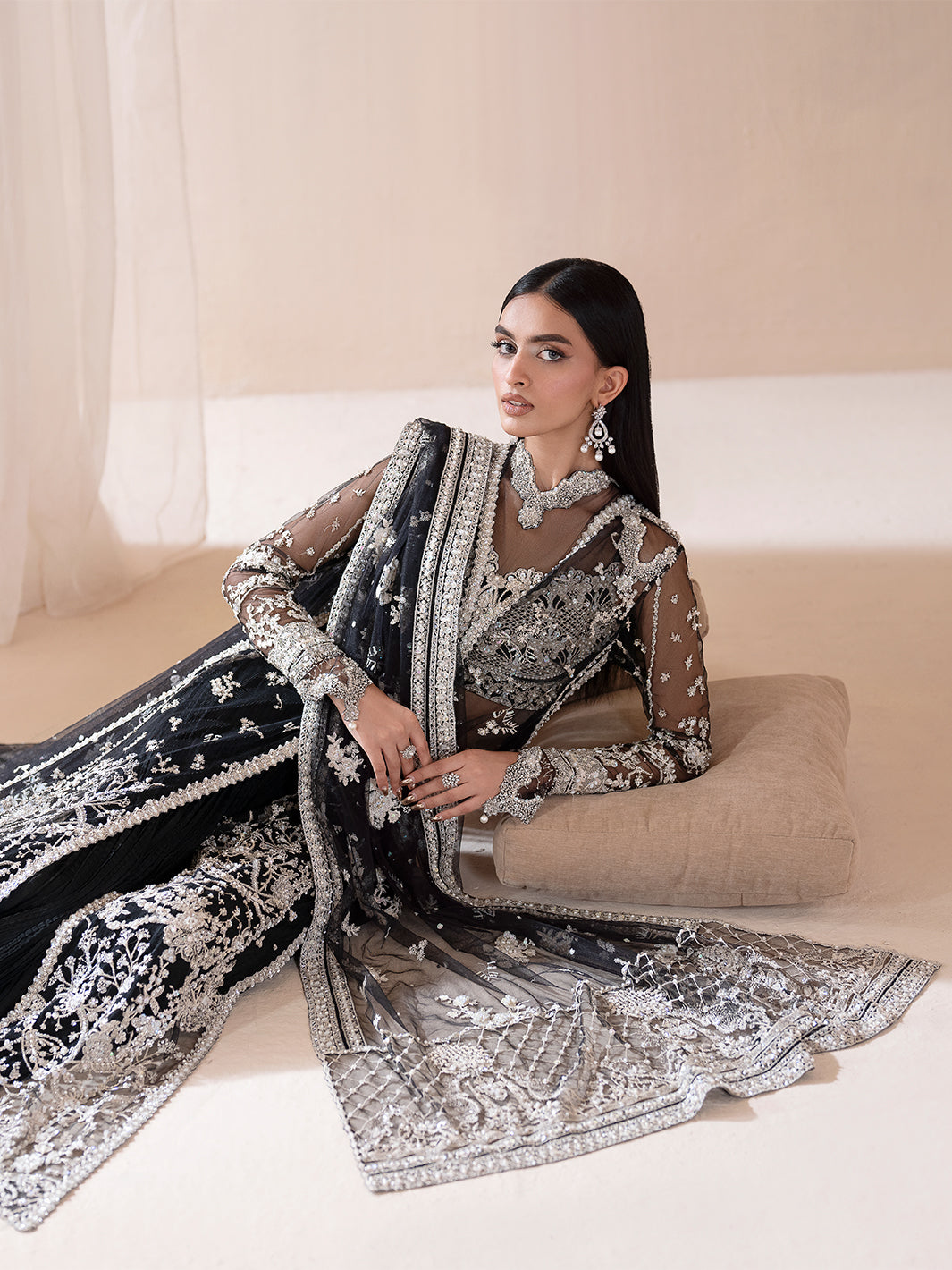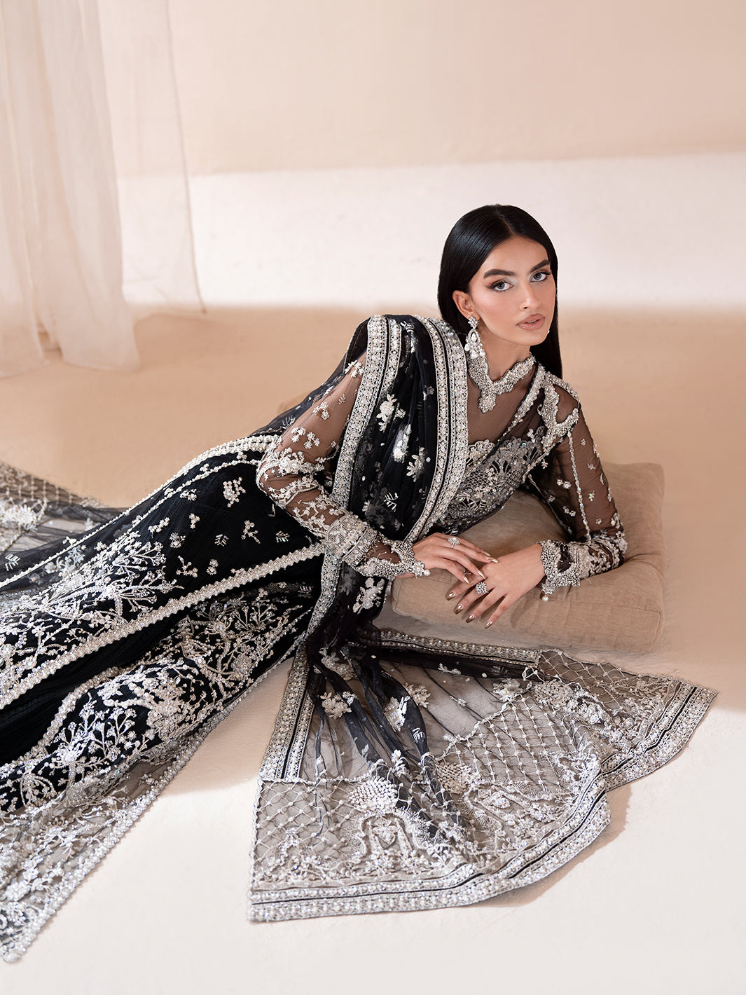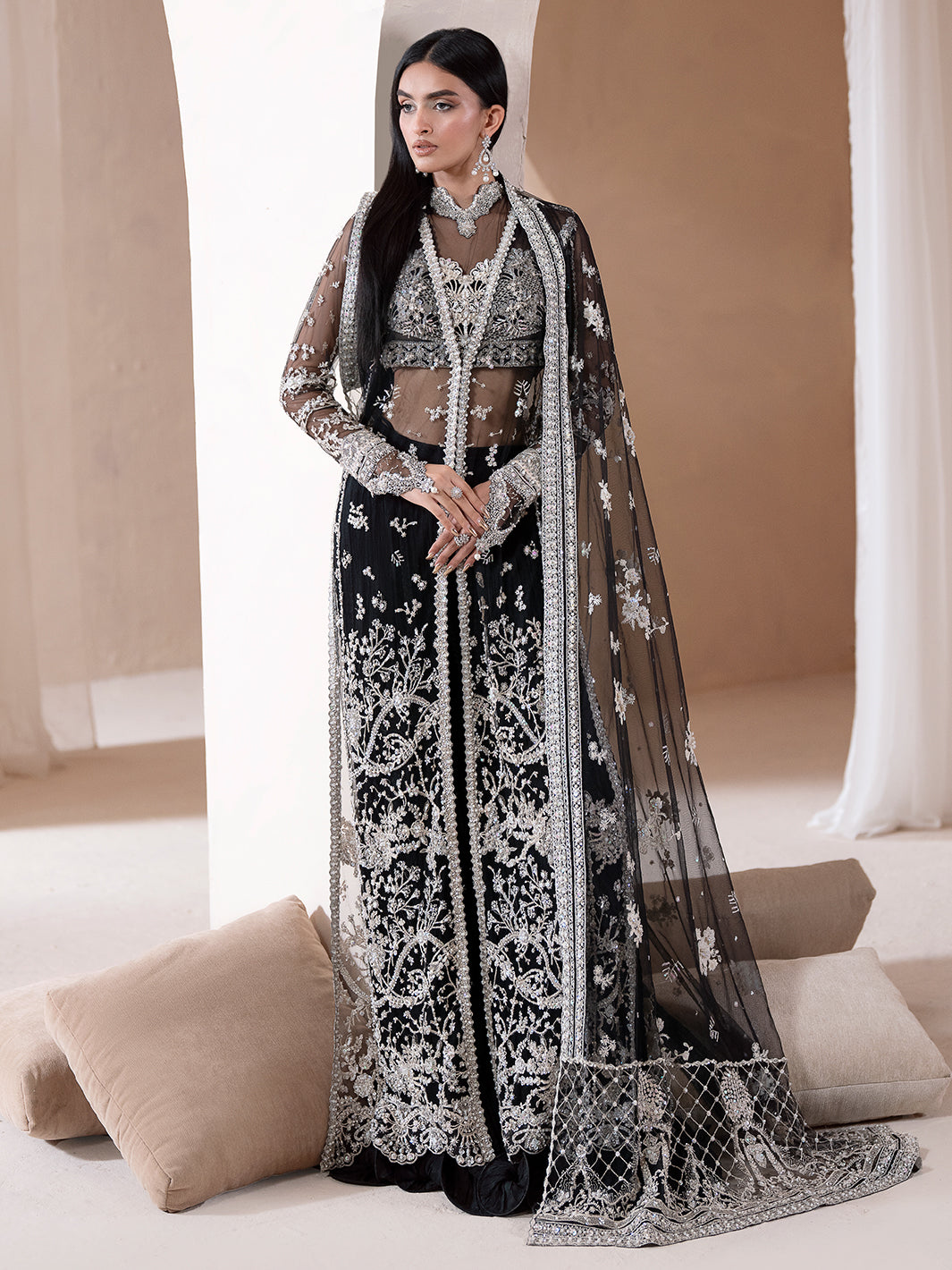 Ardeur the deep allure of black emerges bold, magnetic, and breathtakingly refined. The front-open jacket with a side slit unveils an intricately embellished inner tube blouse, adorned with pearls, crystals, sequins, and cut dana, framing a uniquely detailed neckline. Paired with a flowing crushed sharara and a diaphanous dupatta, the ensemble captures both grace and grandeur. Embellished with threadwork, tilla, batki, pearls, crystals, and sequins, it mirrors the shimmer of starlit nights. A masterpiece of contrast and charisma,Ardeur is strength woven into elegance an ode to the power of poise.