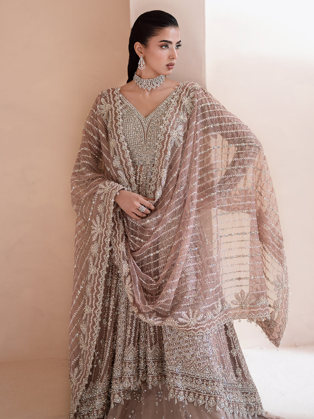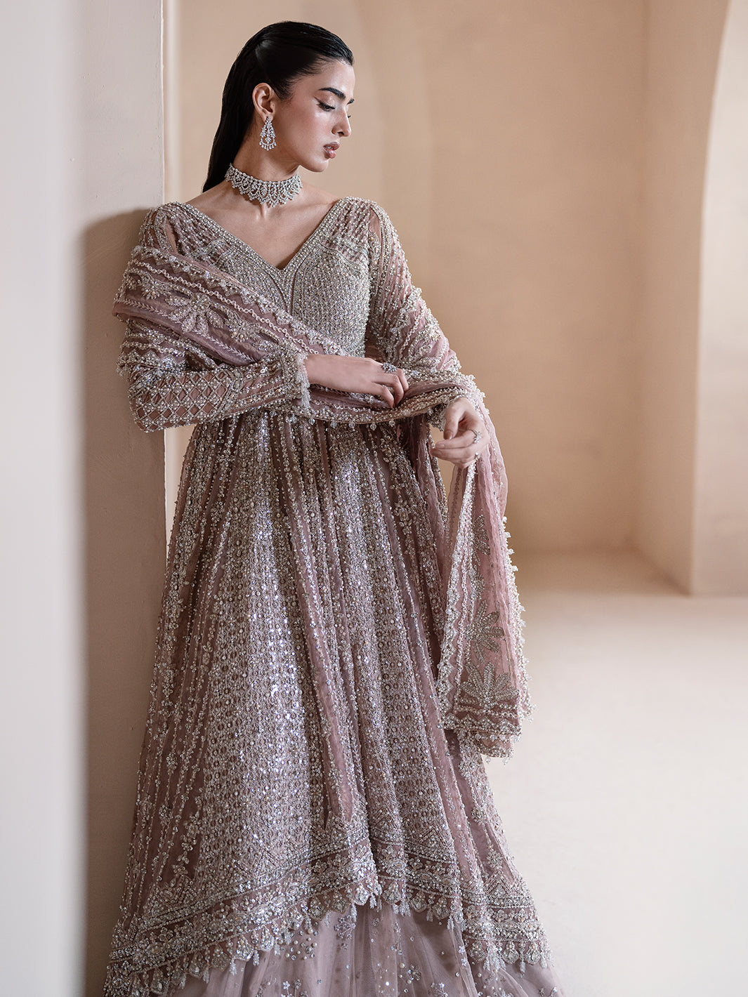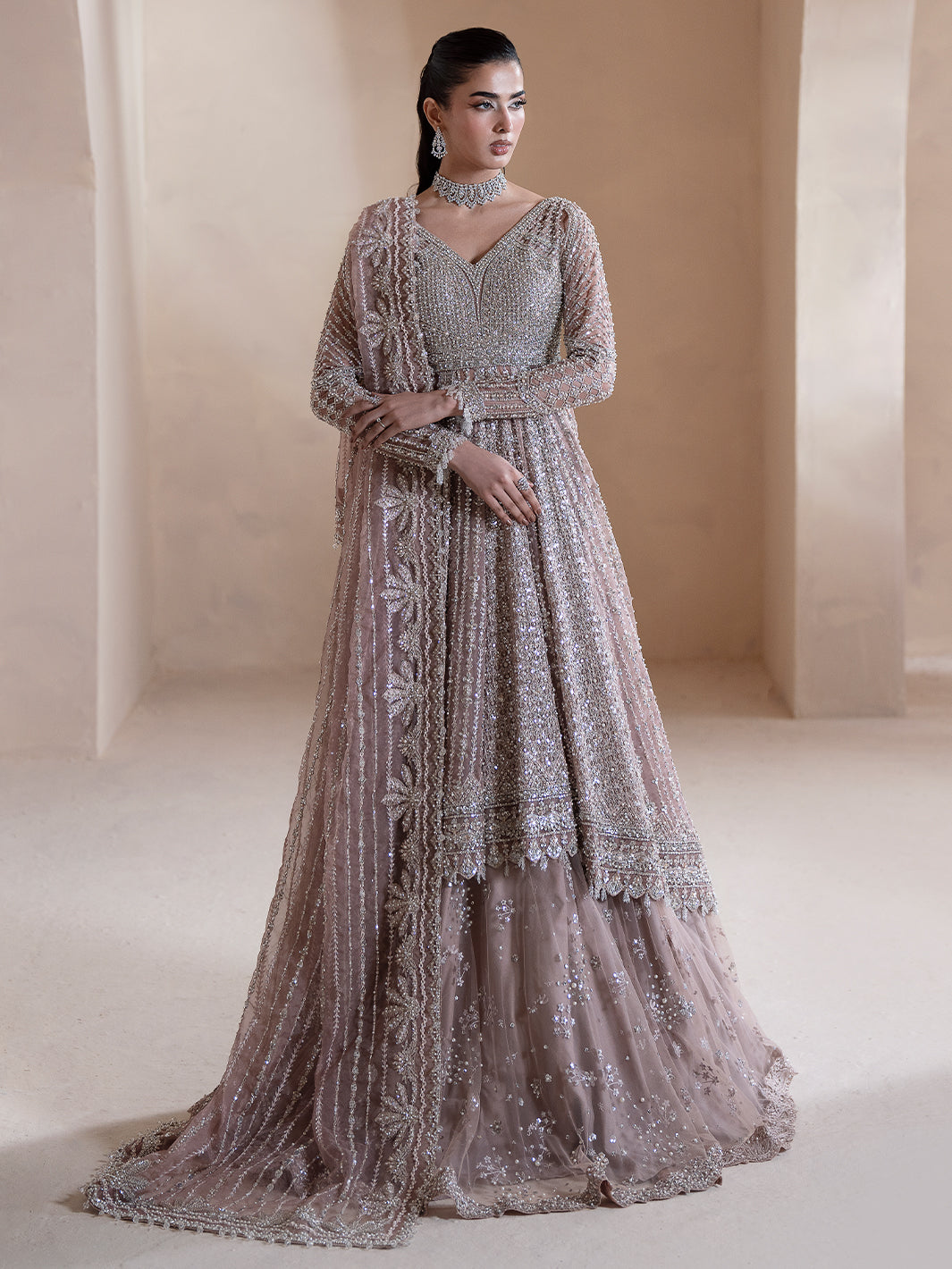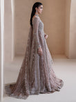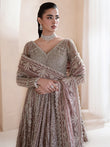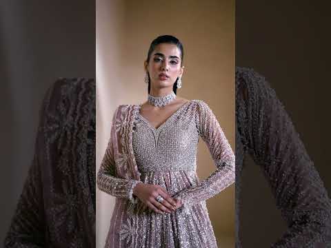 Aurora, a lilac-pink ode to dawn’s first light, blending grace with grandeur. Adorned with tilla, dabka, cut dana, batki, pearls, crystals, sequins, every detail whispers luxury. Paired with a flared lehnga and a two-sided embroidered dupatta, it exudes ethereal charm. A masterpiece where timeless artistry meets luminous elegance.