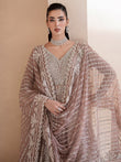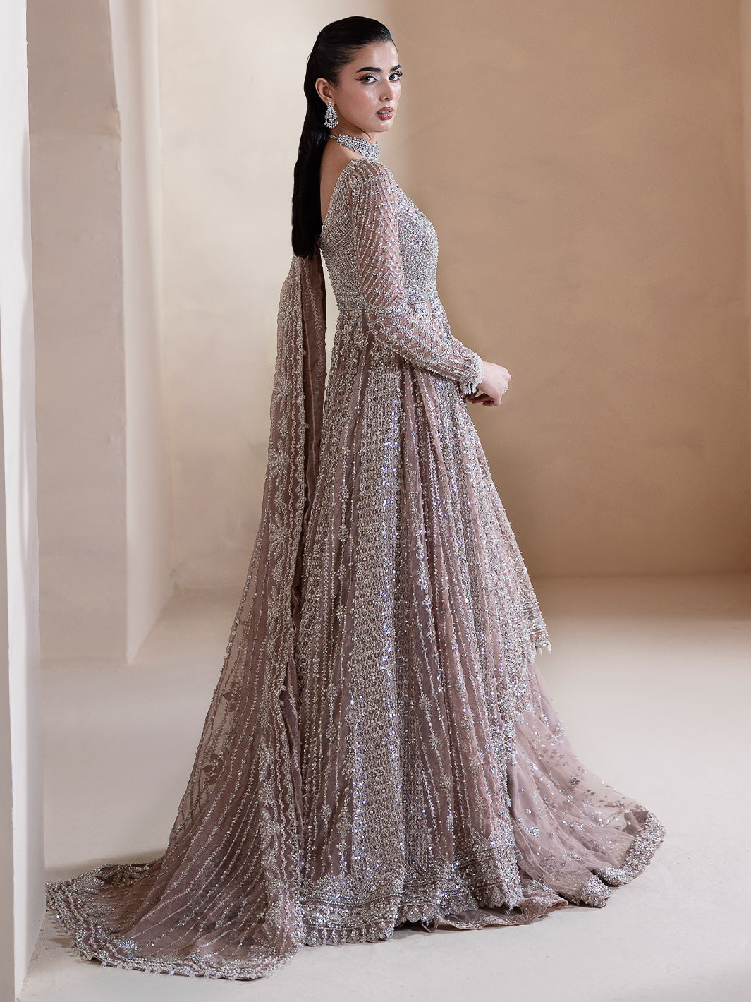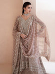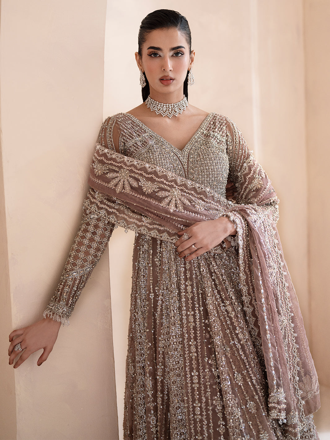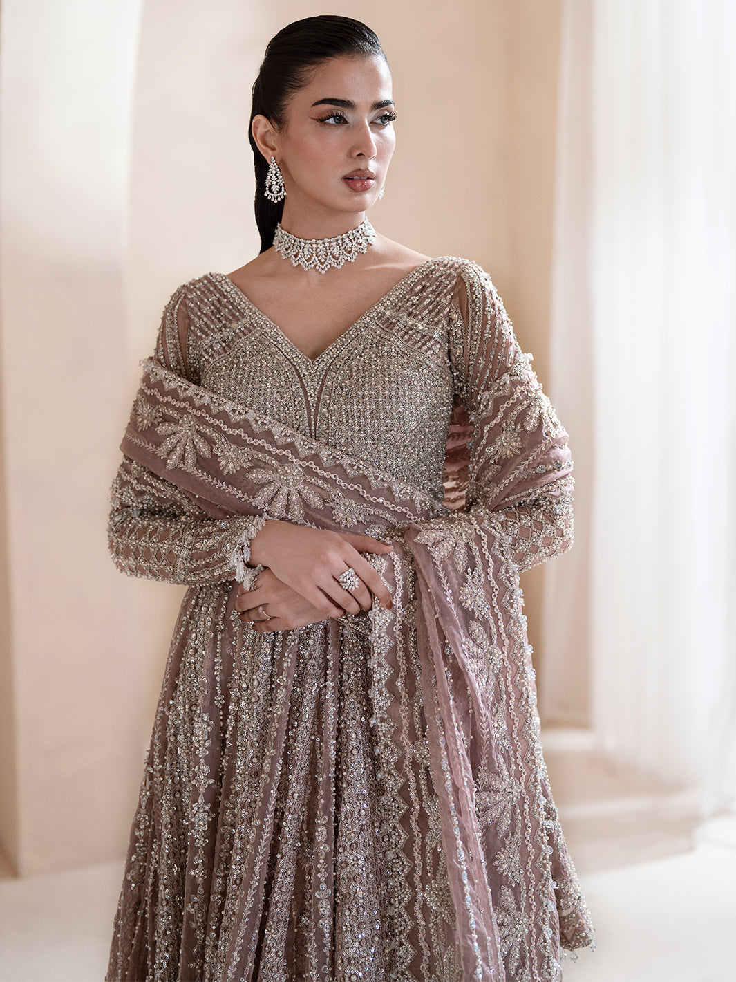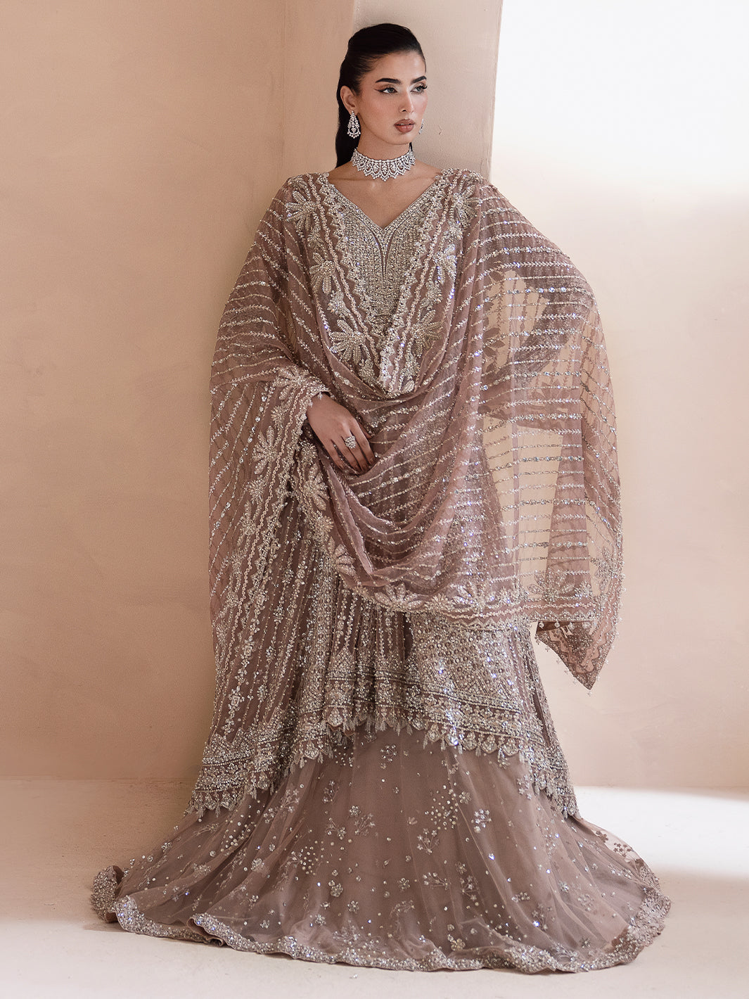 Aurora, a lilac-pink ode to dawn’s first light, blending grace with grandeur. Adorned with tilla, dabka, cut dana, batki, pearls, crystals, sequins, every detail whispers luxury. Paired with a flared lehnga and a two-sided embroidered dupatta, it exudes ethereal charm. A masterpiece where timeless artistry meets luminous elegance.
