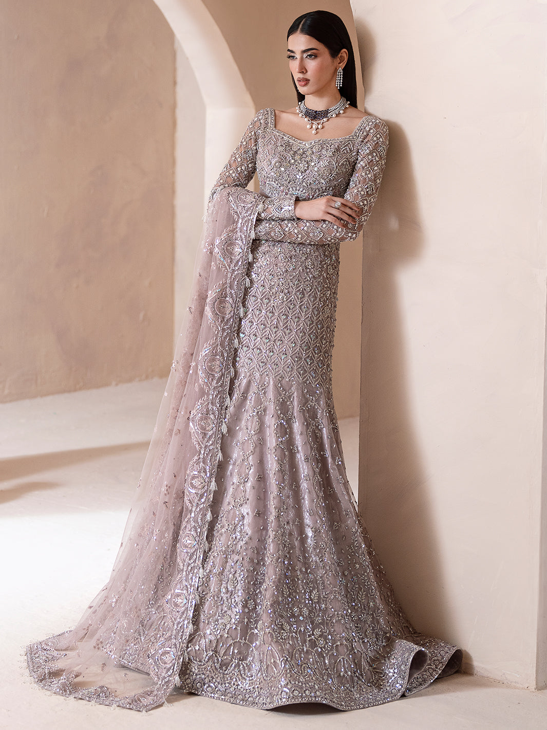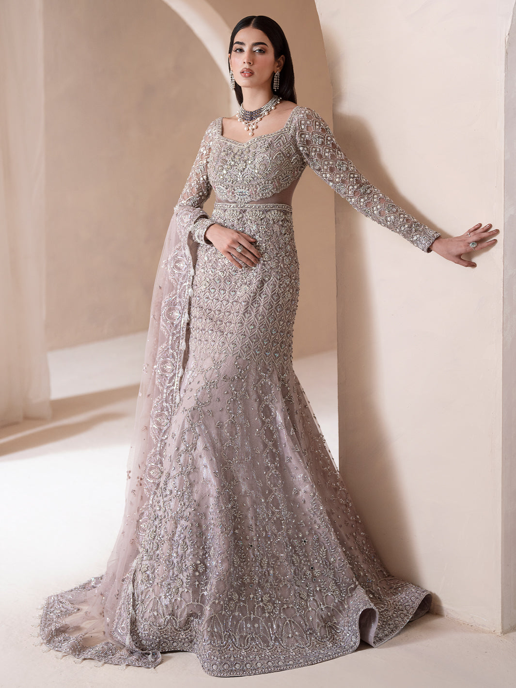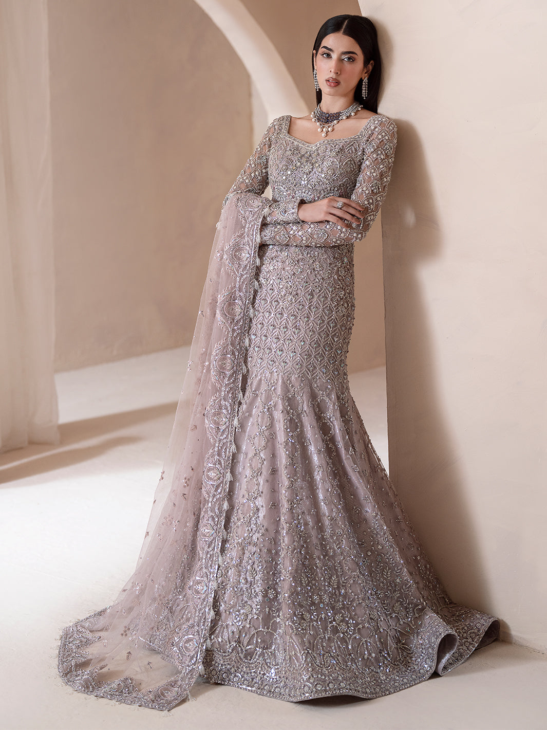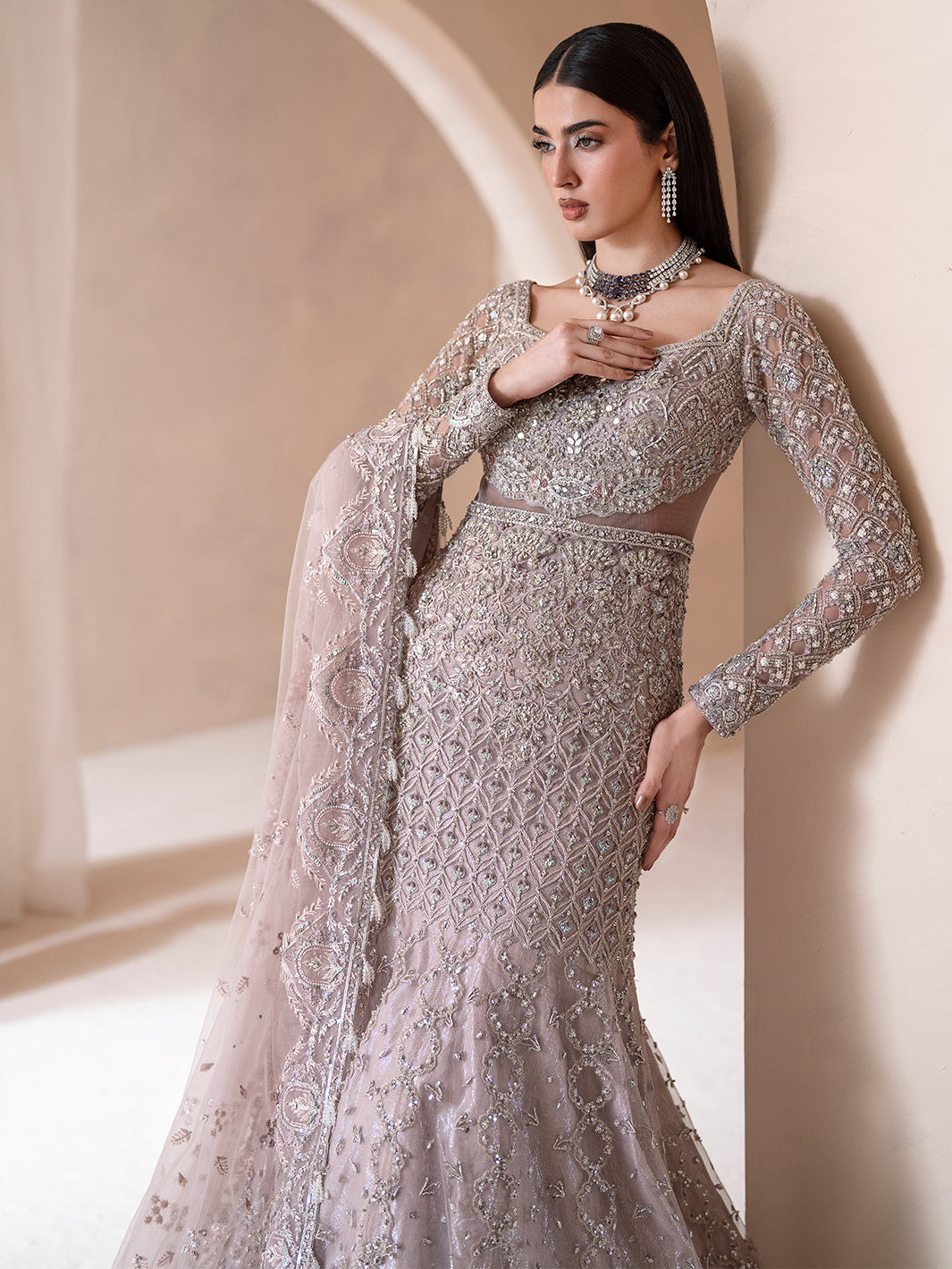 Aveline a light tea-pink marvel sculpted in elegance, where form meets finesse. This mermaid silhouette, paired with an embroidered dupatta, exudes quiet opulence. Adorned with thread work, tilla, cut dana, batki, pearls, crystals, sequins, and intricate mirror work, it gleams with celestial allure. Avline is a portrait of timeless sophistication, luminous, graceful, and impeccably refined.
