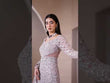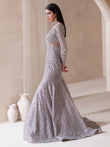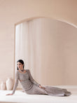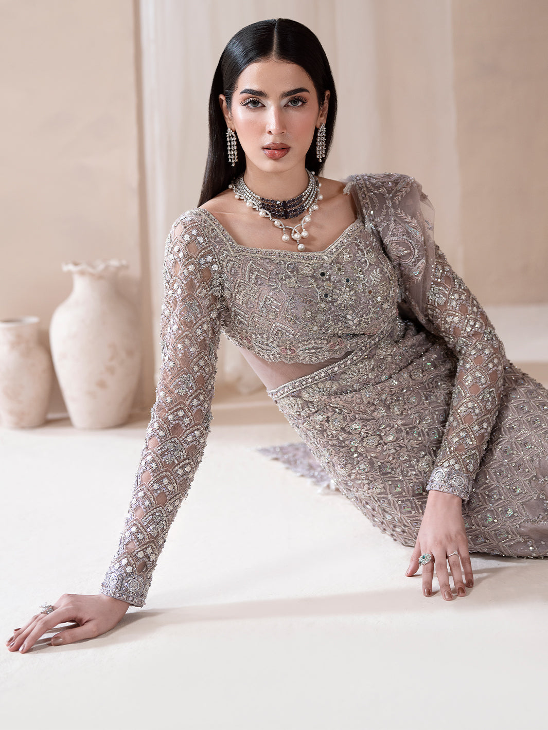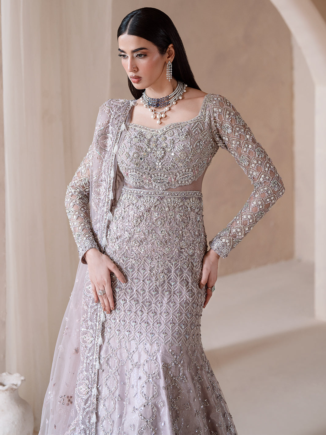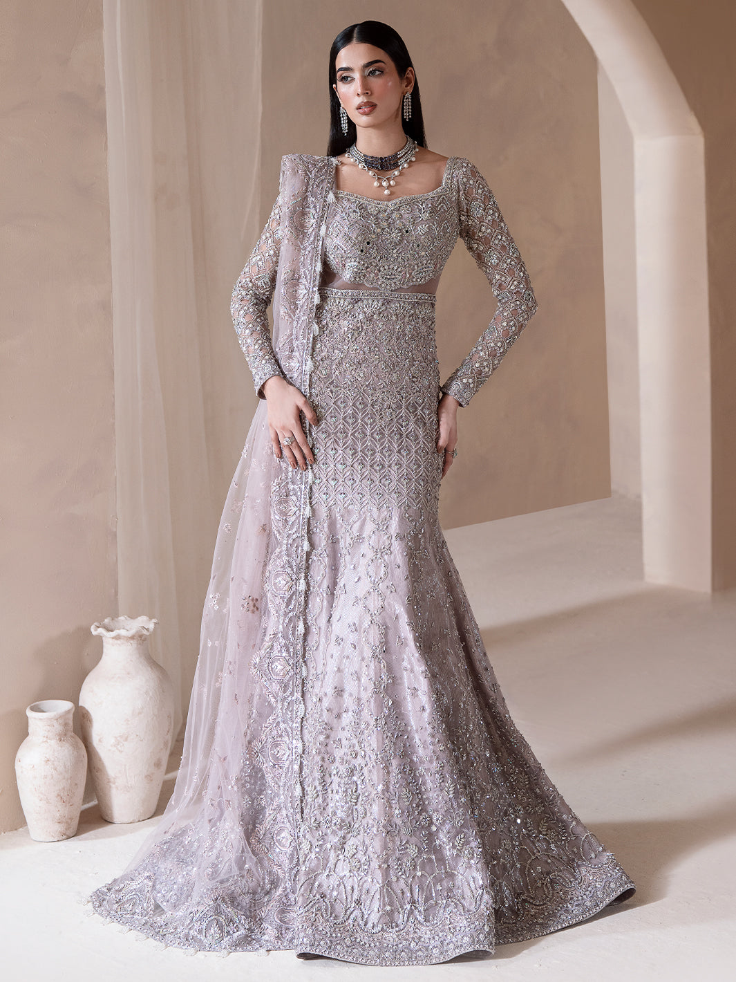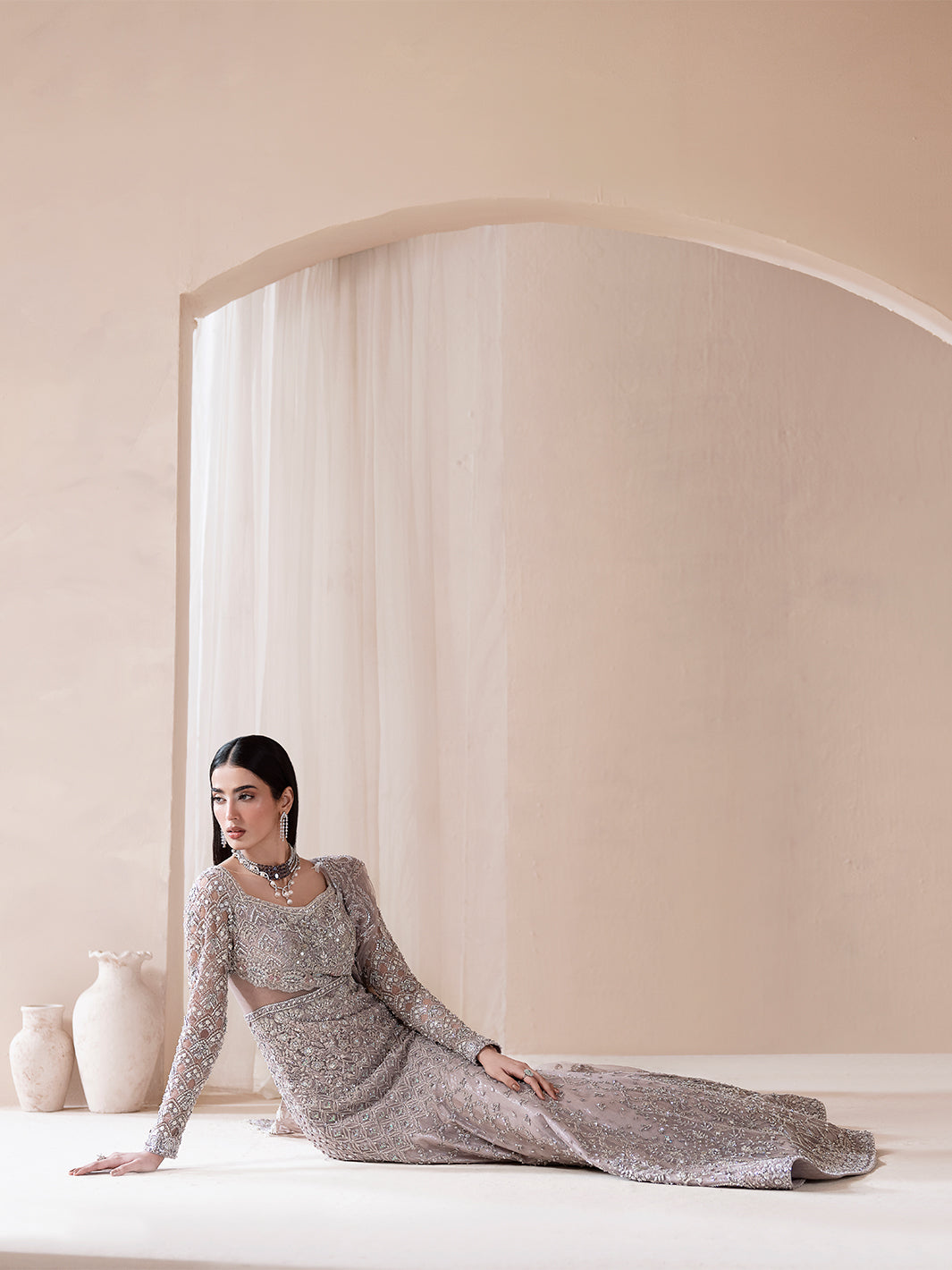 Aveline a light tea-pink marvel sculpted in elegance, where form meets finesse. This mermaid silhouette, paired with an embroidered dupatta, exudes quiet opulence. Adorned with thread work, tilla, cut dana, batki, pearls, crystals, sequins, and intricate mirror work, it gleams with celestial allure. Avline is a portrait of timeless sophistication, luminous, graceful, and impeccably refined.