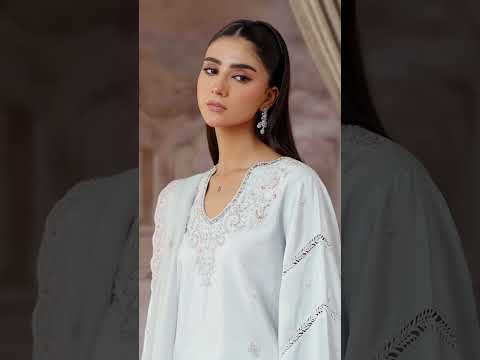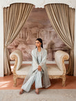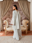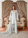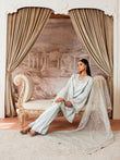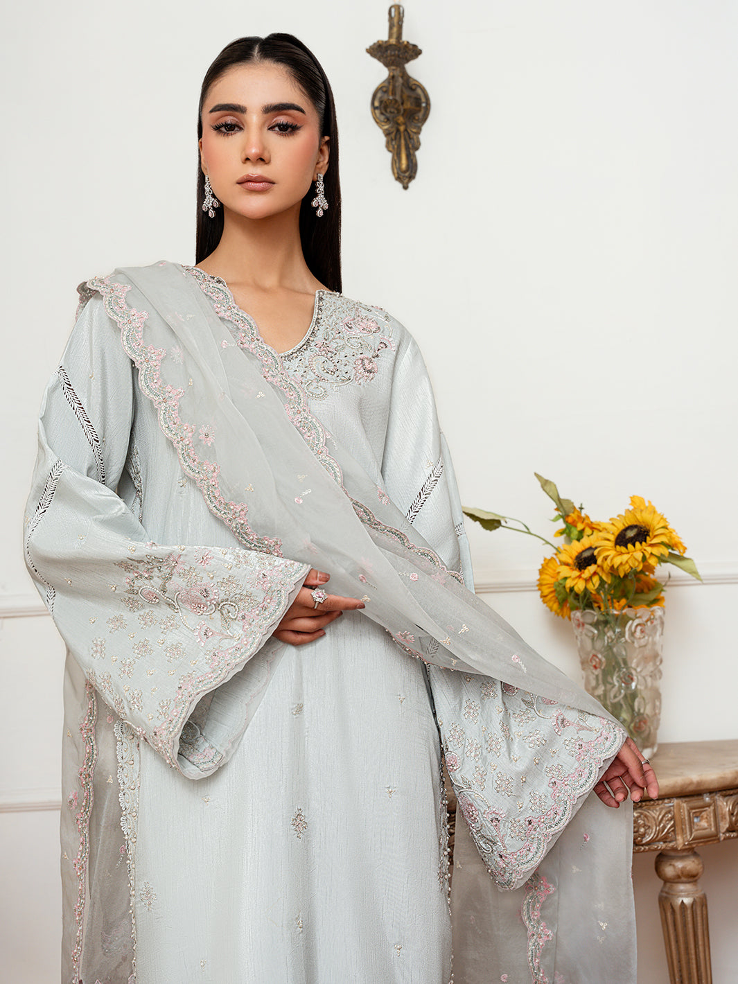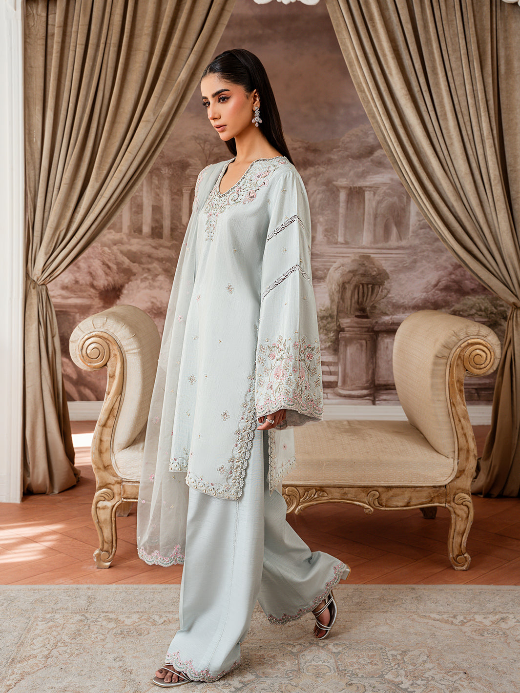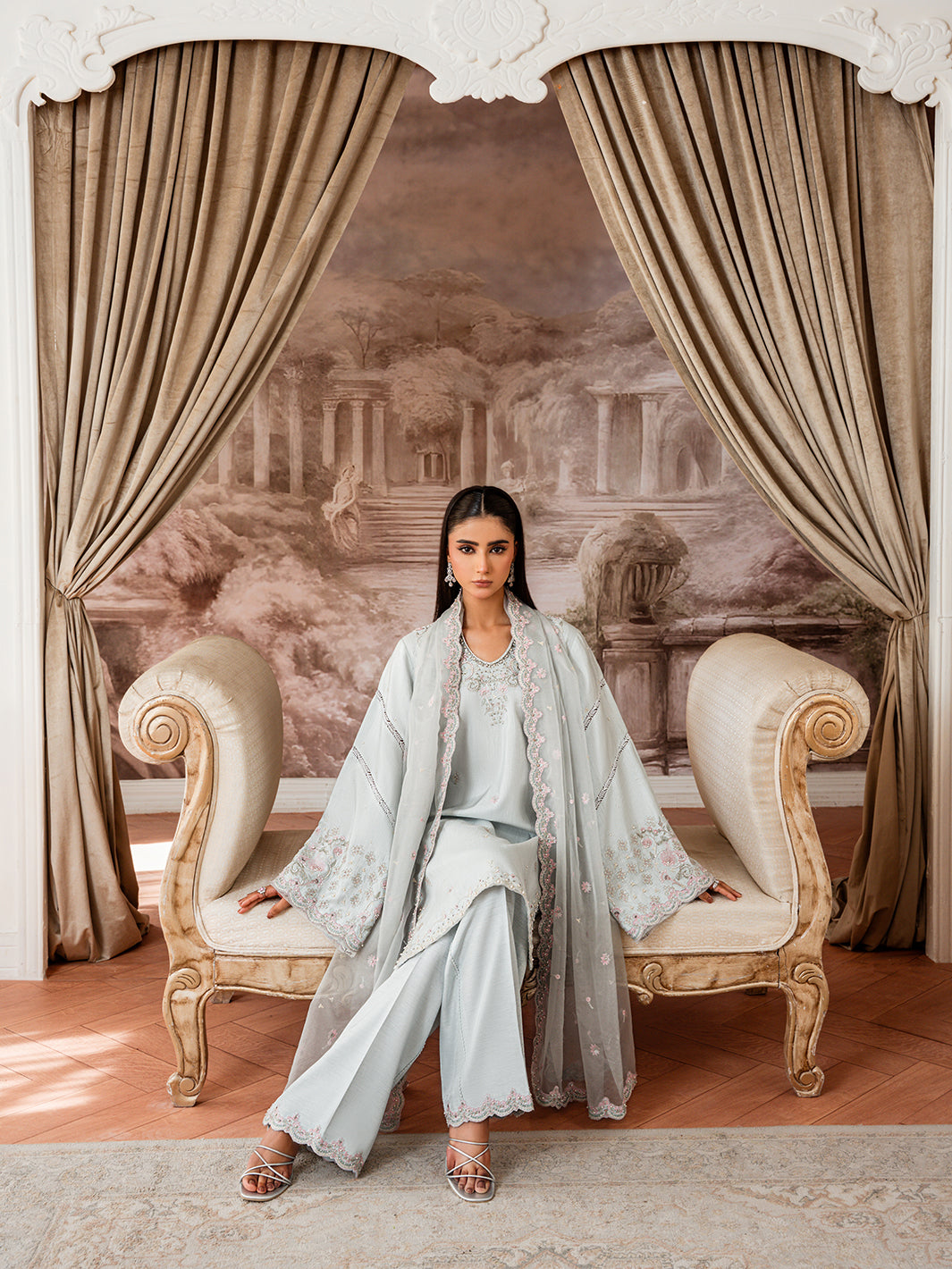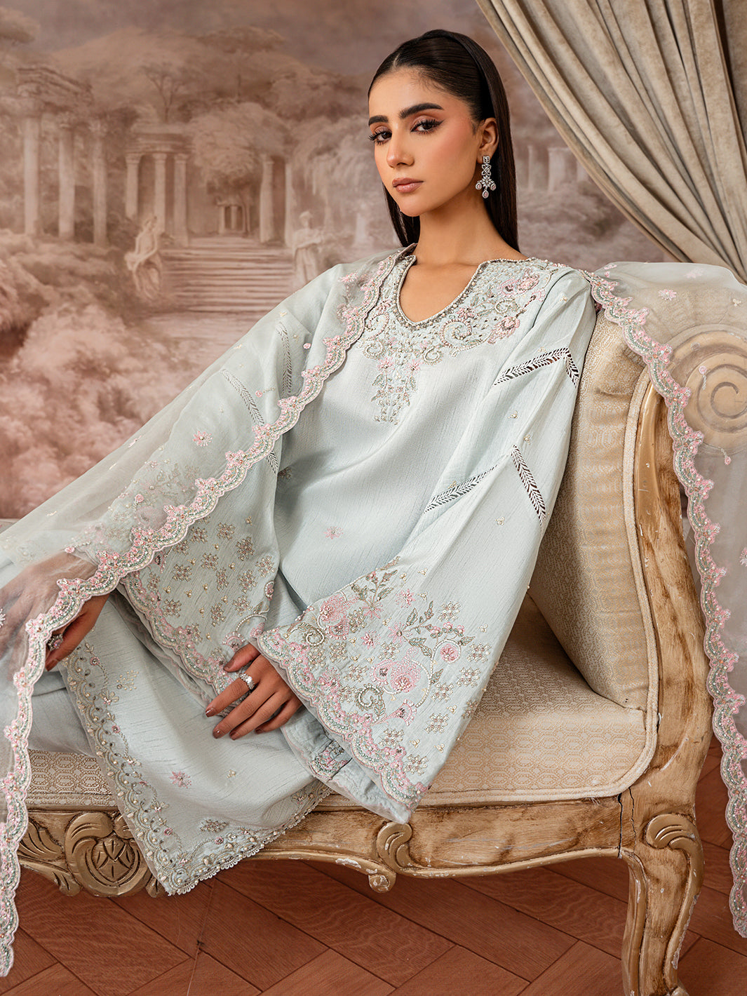 Azure — a sky-blue Korean silk semi-formal ensemble, masterfully adorned with intricate thread work, cut dana accents, lustrous pearls, traditional baitki motifs, crystal floral embellishments, and delicate lace detailing. The gown features a precisely defined back neckline, complemented by elegantly embroidered loose pants and a finely detailed organza dupatta. Presented in a refined evening setting with soft, directional lighting and ethereal sky-blue tones, the ensemble exemplifies meticulous craftsmanship, timeless sophistication