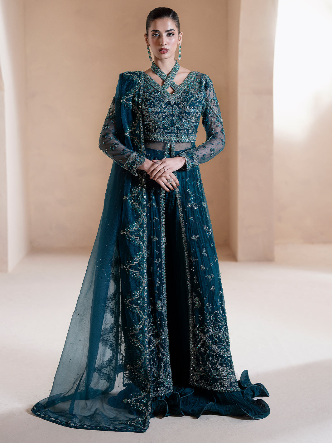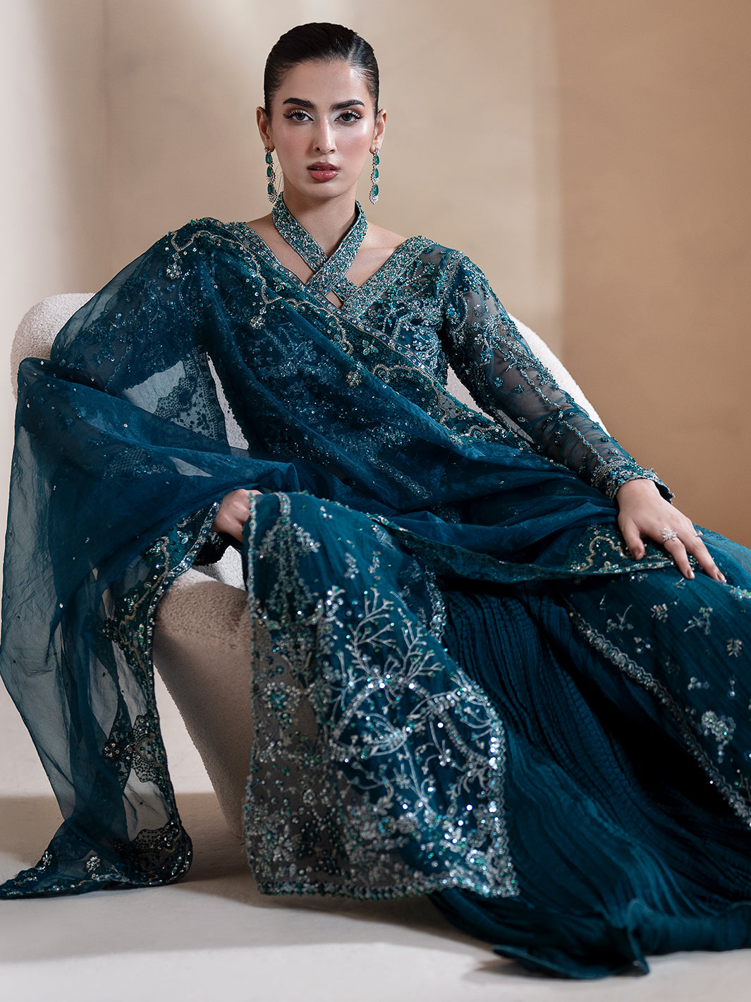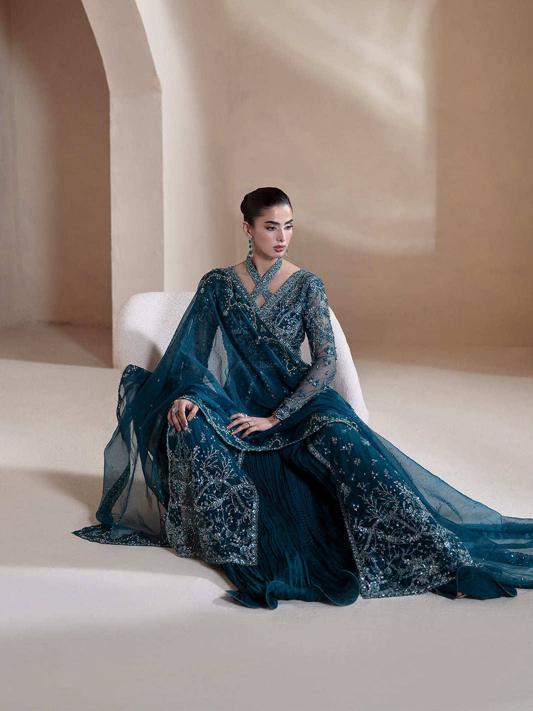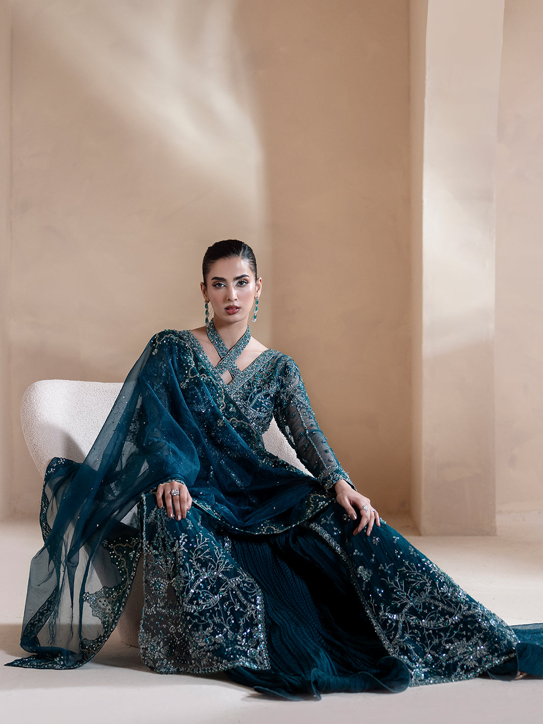 Bijou, a teal grandeur, pairs an open shirt with a flowing sharara. It is a jeweler's art, with Tilla embroidery anchoring cut dana, flower batki, and heirloom pearls. Precision crystals and sequins cascade beside sculpted 3D flowers, creating a masterpiece of wearable art.