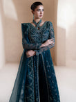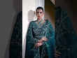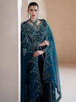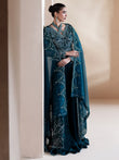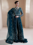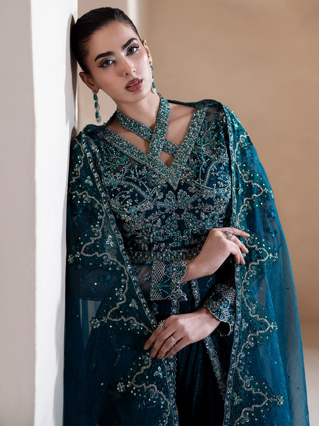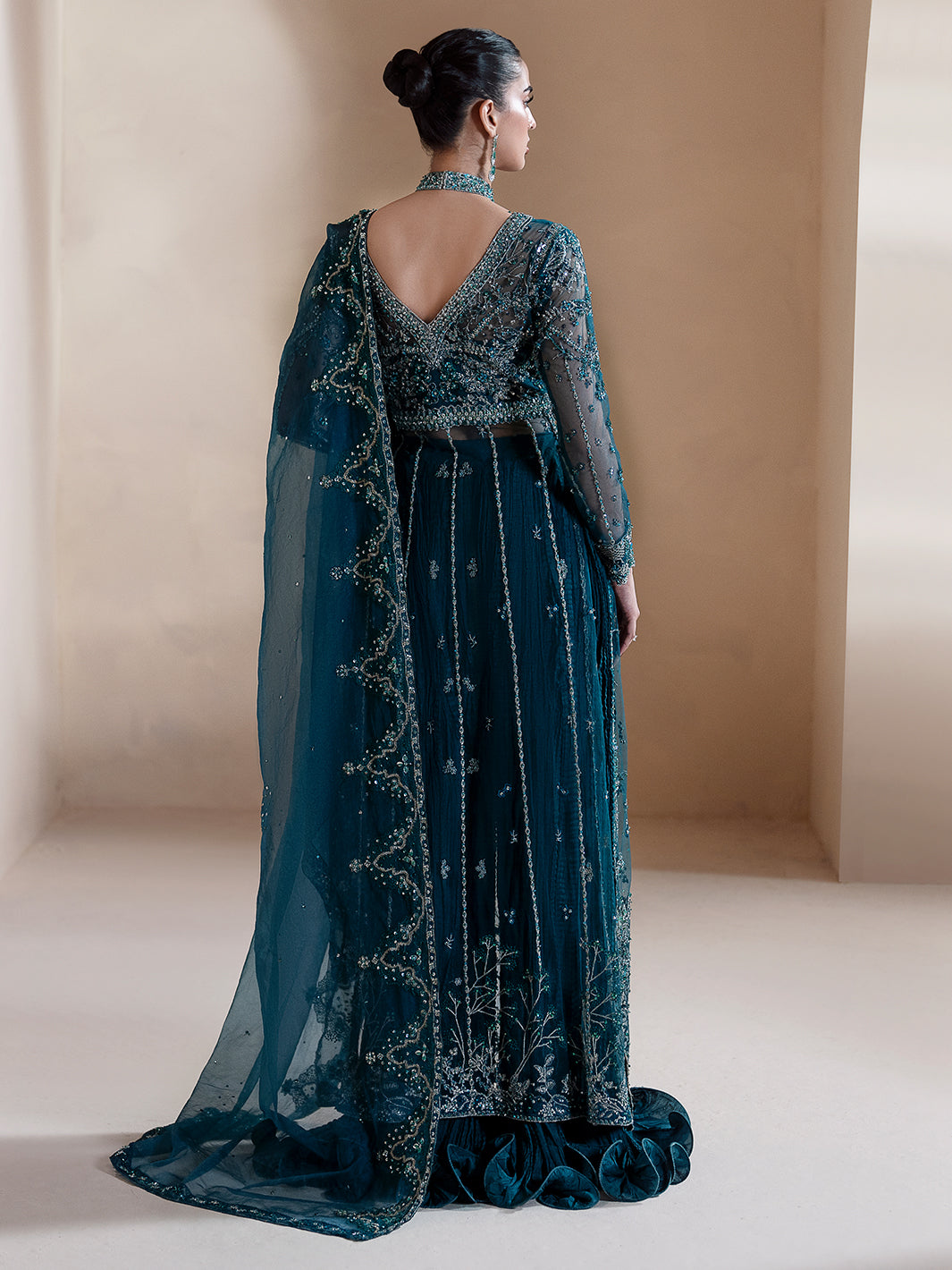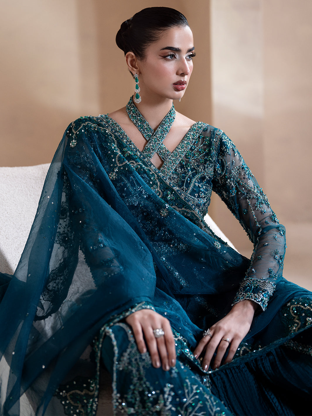 Bijou, a teal grandeur, pairs an open shirt with a flowing sharara. It is a jeweler's art, with Tilla embroidery anchoring cut dana, flower batki, and heirloom pearls. Precision crystals and sequins cascade beside sculpted 3D flowers, creating a masterpiece of wearable art.