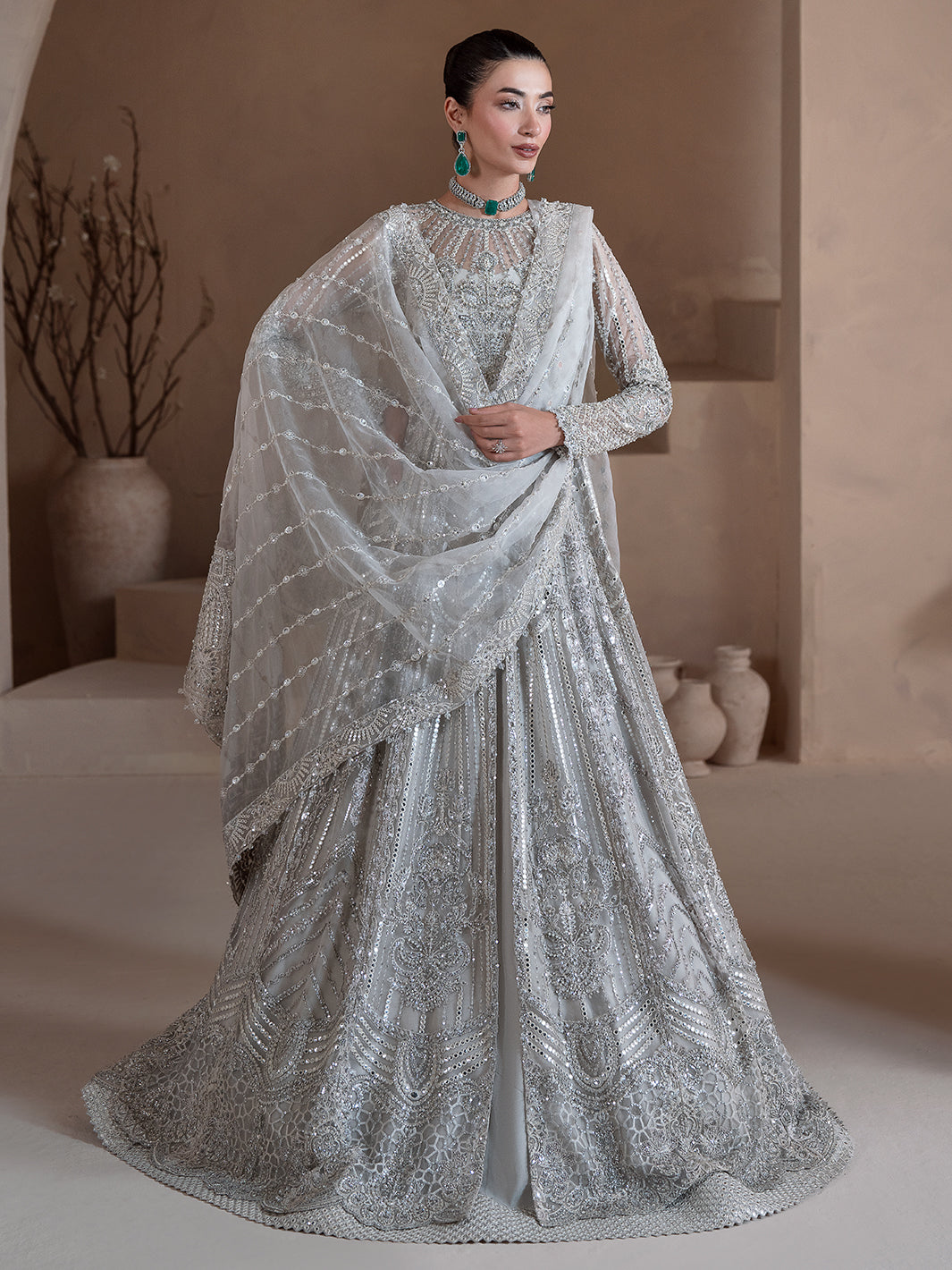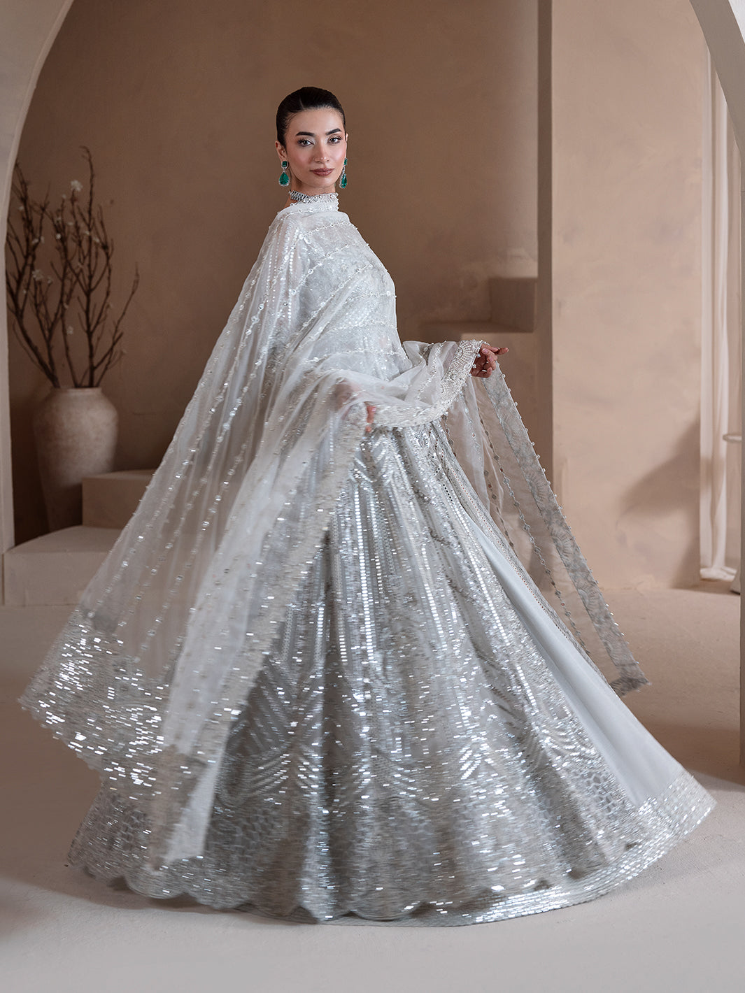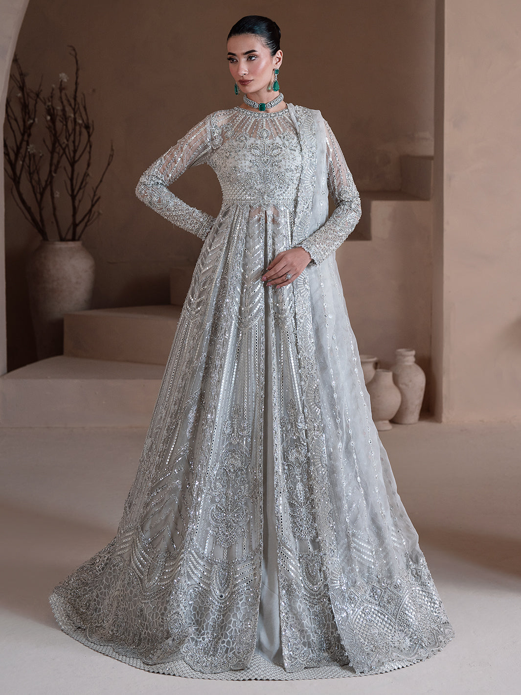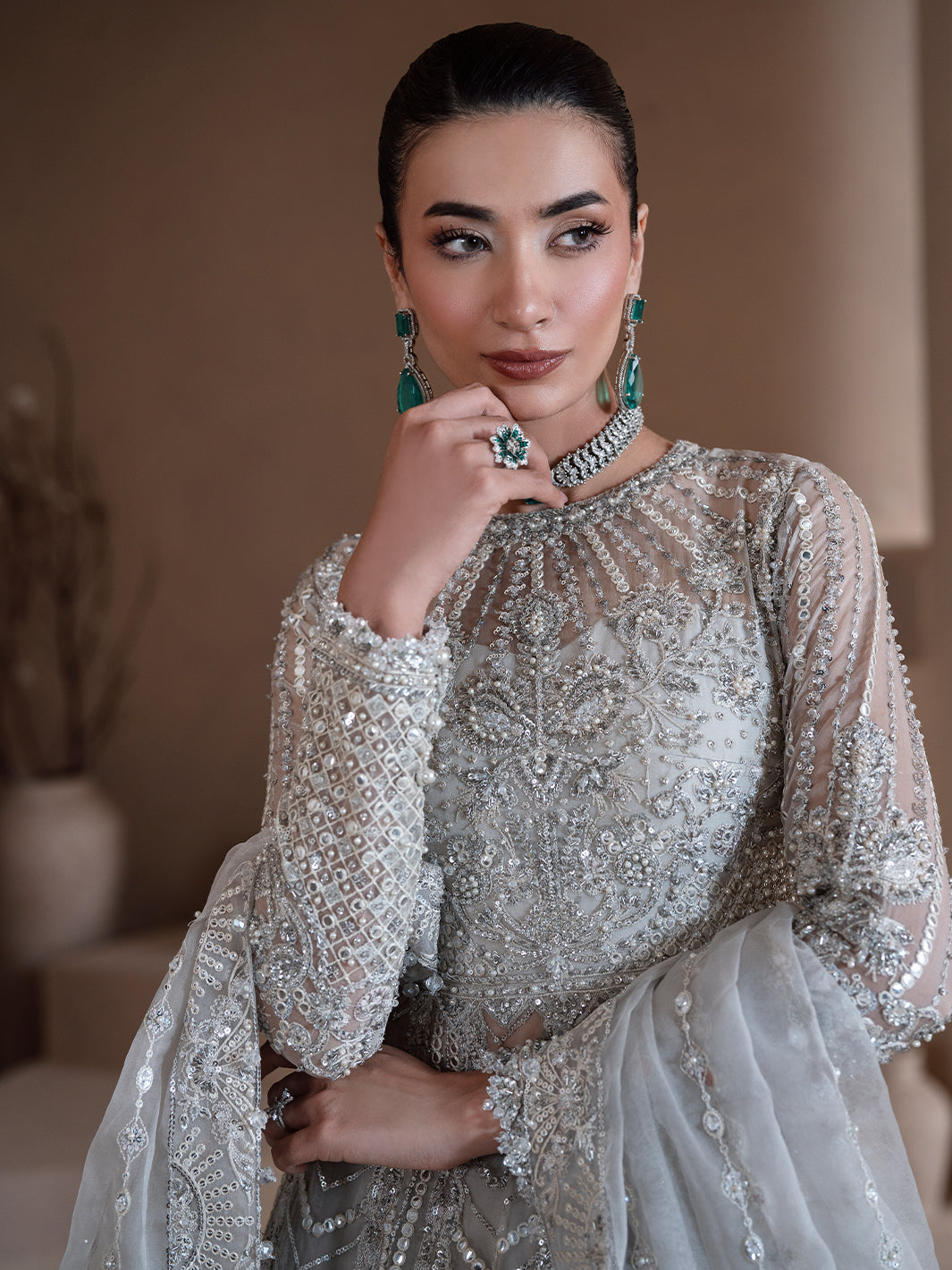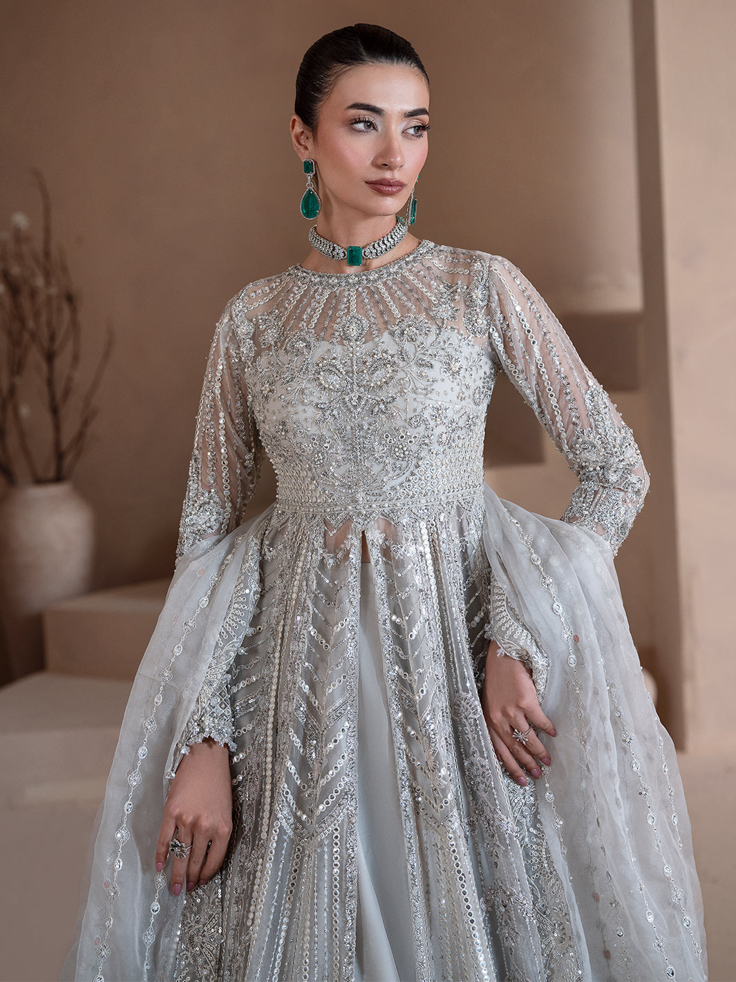 Elysian a celestial vision in grey white, where serenity meets splendour. The panni pishwas, opening gracefully at the front, flows into a regal lehnga and gossamer dupatta. Embellished with thread work, tilla, cut dana, batki, pearls, crystals, panni, and sequins, it glistens like moonlight upon silver mist. Elysian transcends couture — a reverie woven in grace, radiance, and divine craftsmanship.