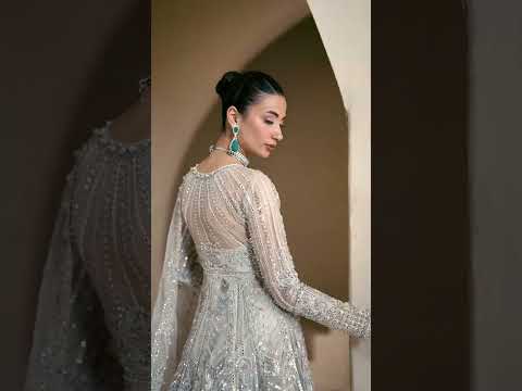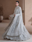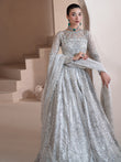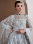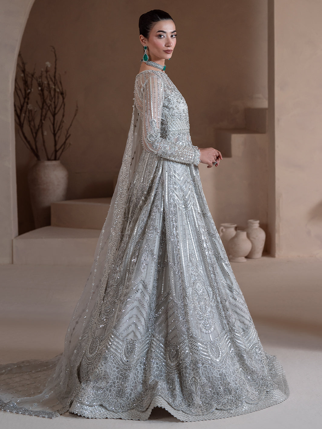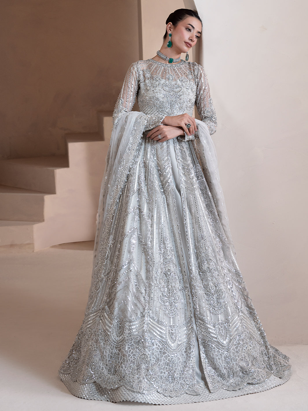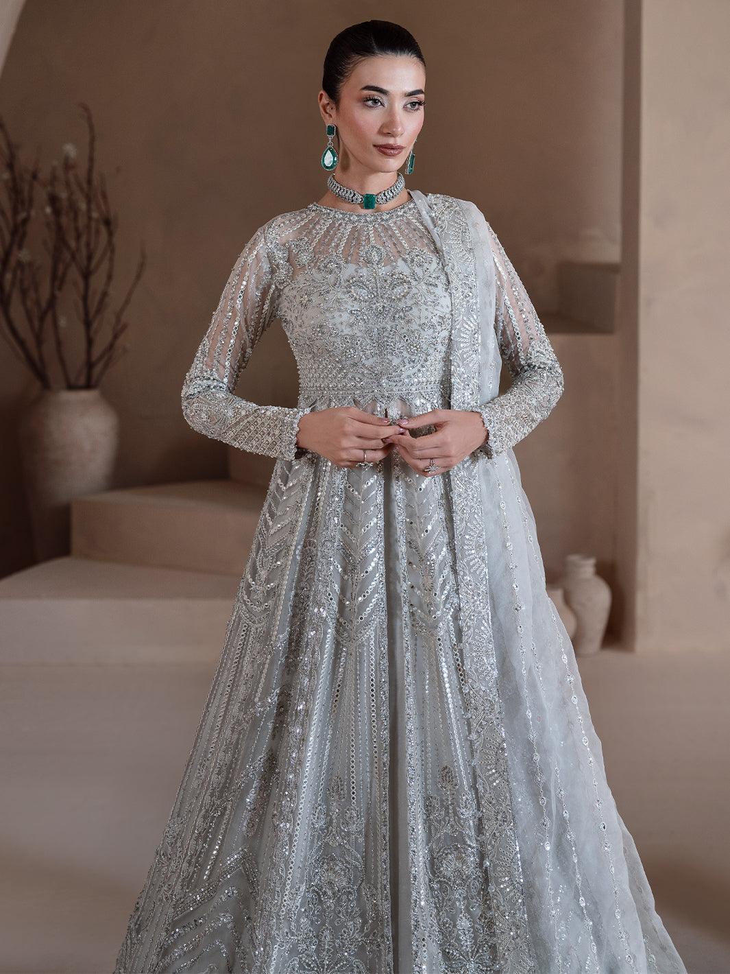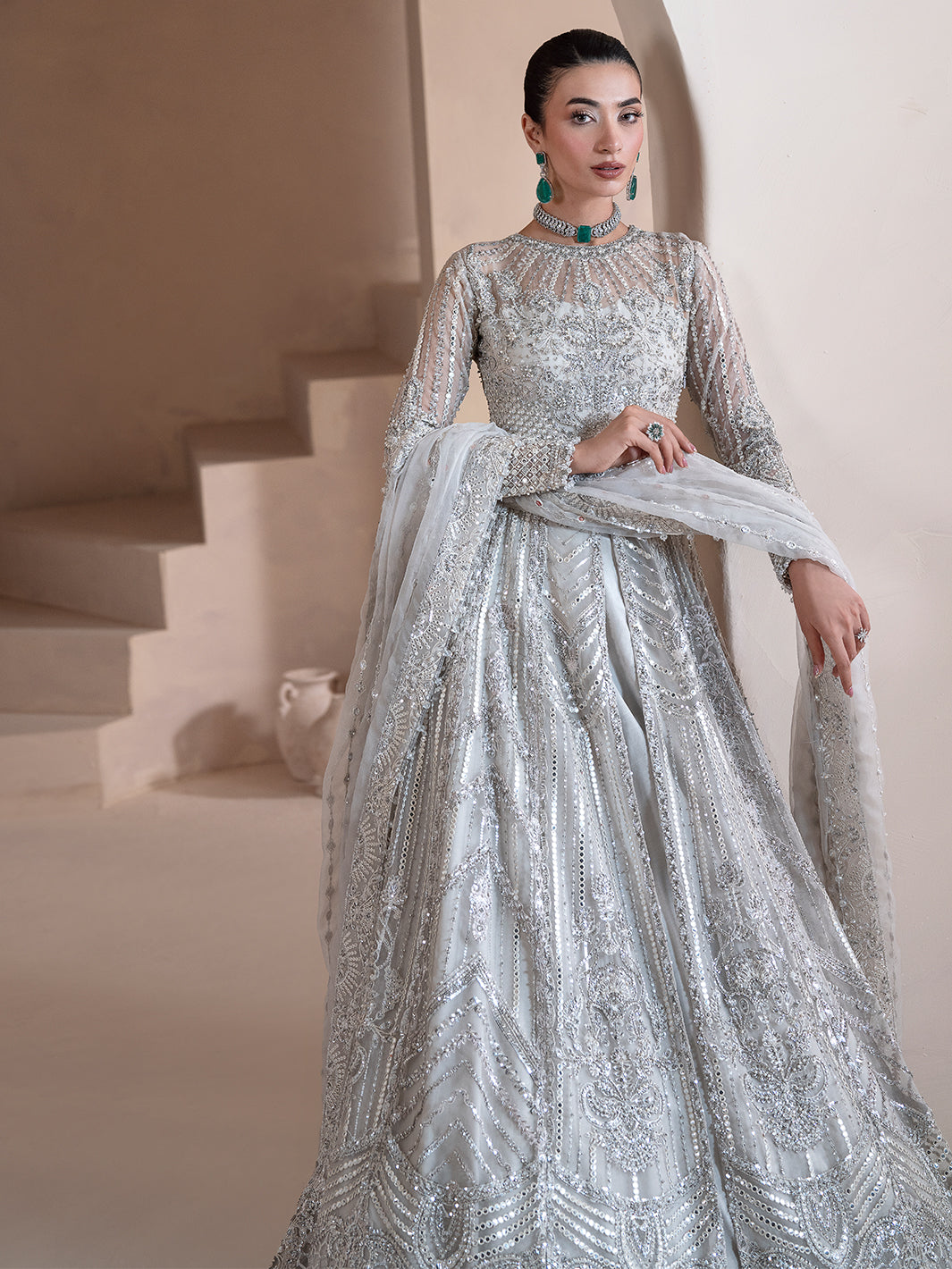 Elysian a celestial vision in grey white, where serenity meets splendour. The panni pishwas, opening gracefully at the front, flows into a regal lehnga and gossamer dupatta. Embellished with thread work, tilla, cut dana, batki, pearls, crystals, panni, and sequins, it glistens like moonlight upon silver mist. Elysian transcends couture — a reverie woven in grace, radiance, and divine craftsmanship.