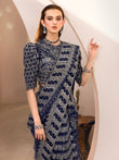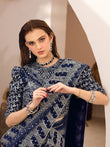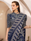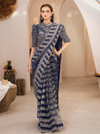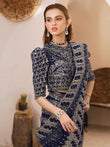Indulge in the enchanting allure of our navy-blue net saree, a masterpiece of elegance and refinement. This exquisite saree features hand-embellished silver borders that shimmer with every movement, adding a touch of sophistication and grace to the ethereal net fabric.Paired with a matching navy-blue blouse, this ensemble is a true celebration of intricate craftsmanship. The blouse is adorned with delicate silver handcrafting and adorned with shimmering beads, creating a harmonious blend of texture and sparkle. Each element of the blouse is meticulously designed, enhancing the overall opulence of the outfit.