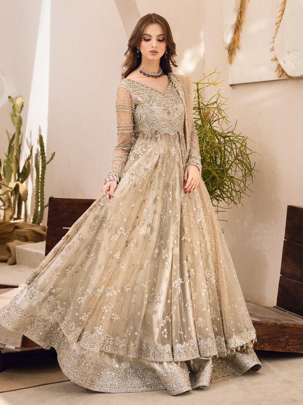 Introducing our luxurious Ivory Net Dress, a masterpiece of craftsmanship and elegance. This stunning ensemble features a hand-embellished blouse, intricately designed to showcase meticulous artistry. The blouse flows into long, hand-crafted flares adorned with embellished raw silk silver borders, adding a touch of opulence to the garment. Paired with this exquisite top is a silver lengha, embellished with a beautifully intricate border that complements the overall design. The outfit is completed with a delicate net dupatta, enhancing the ensemble's grace and sophistication.