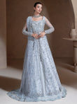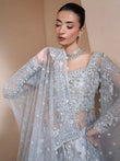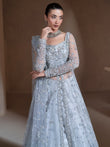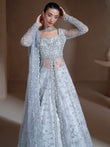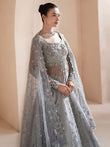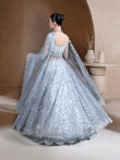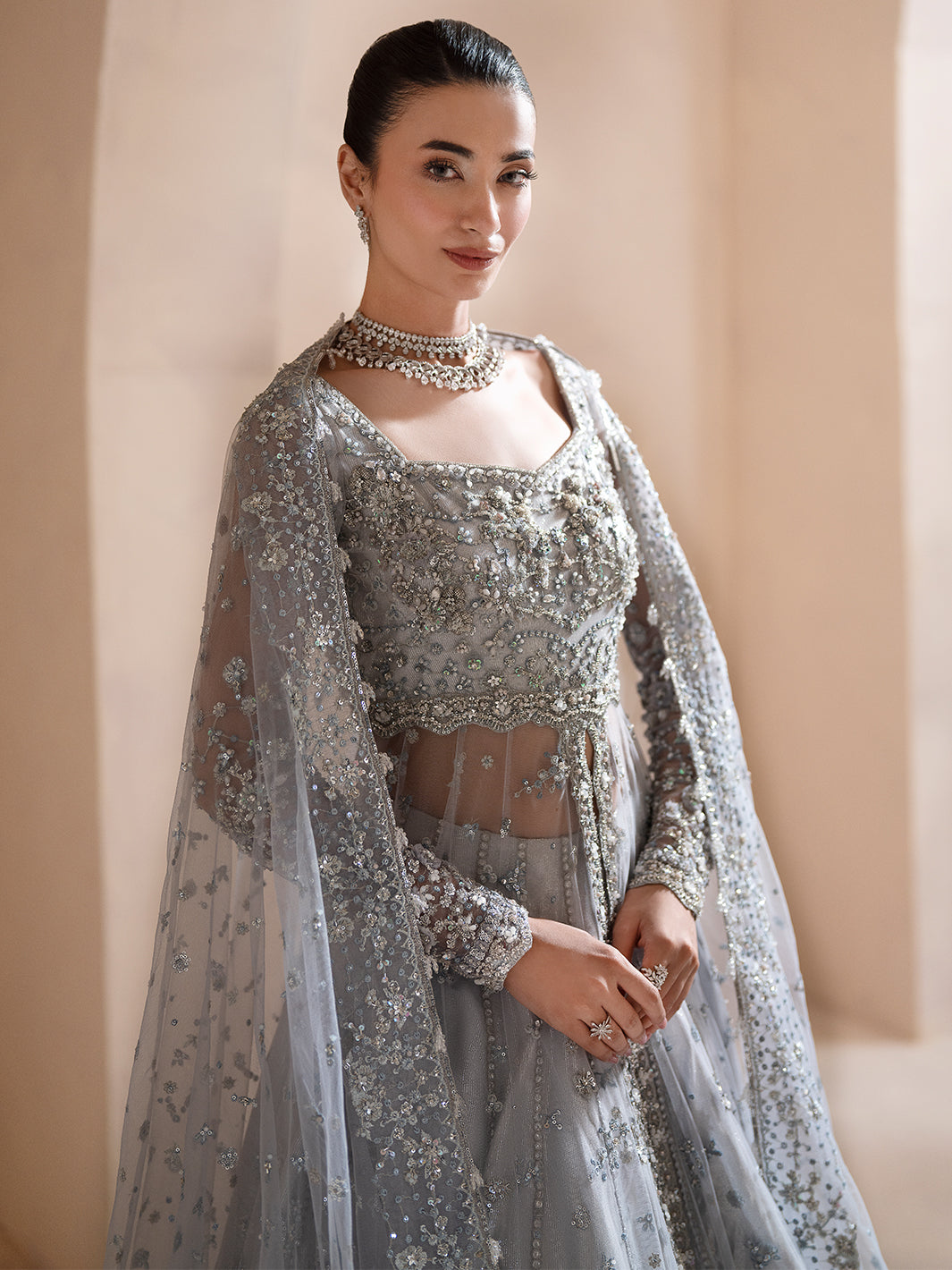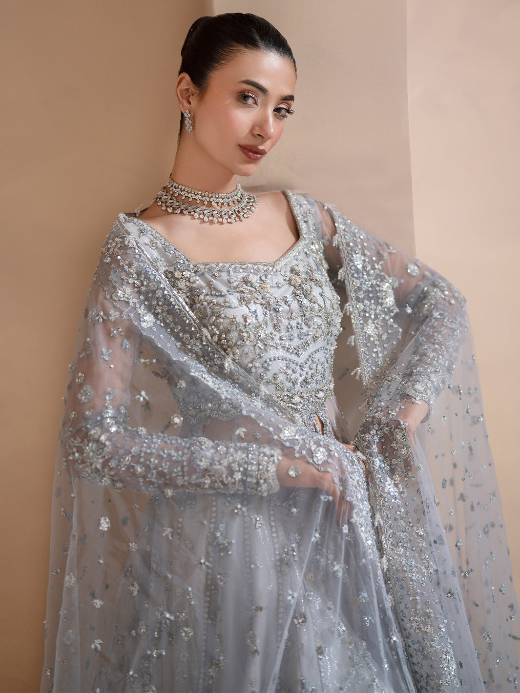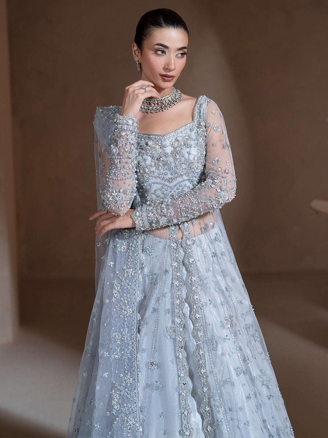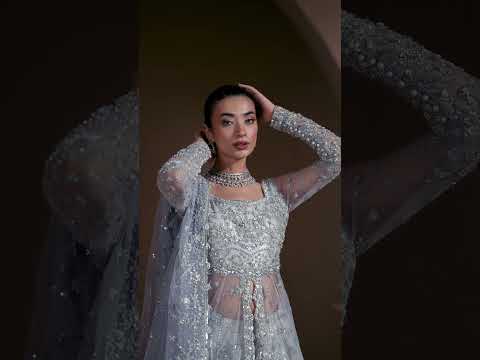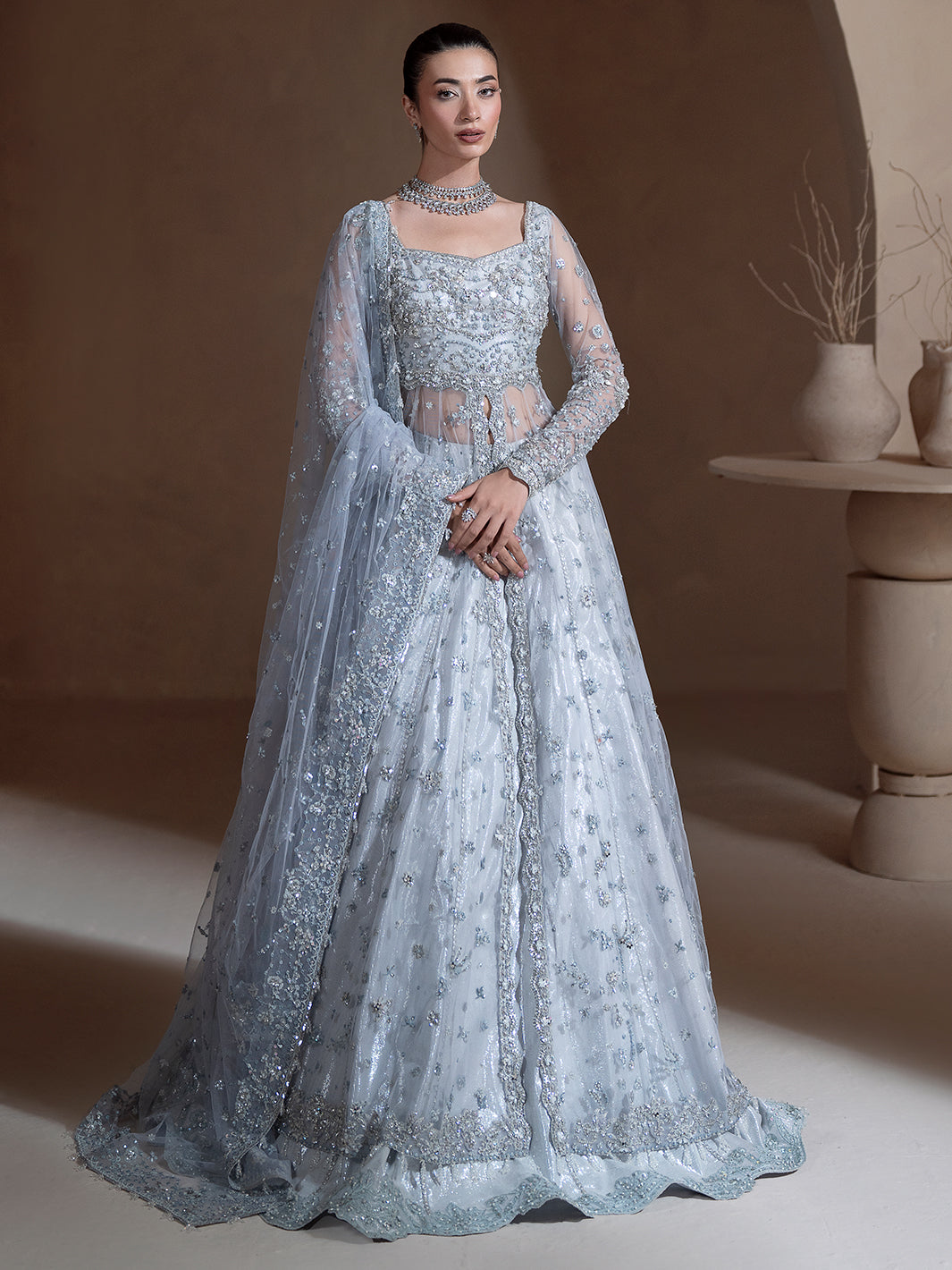 L’éclat bathed in the serenity of powder blue,reflects a radiance both soft and commanding. Its front-open pishwas, paired with a flowing lehnga and gossamer dupatta, evokes ethereal sophistication. Adorned with thread work, tilla, cut dana, batki, pearls, crystals, and sequins, it shimmers with quiet luminosity. L’éclat — a whisper of elegance, where light finds its most graceful form.