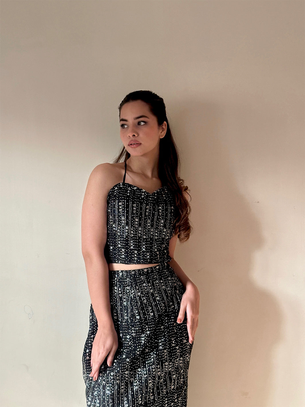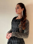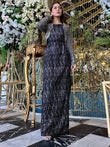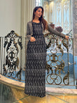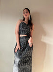 Immerse the enchanting appeal of an all-black ensemble, enhanced by exquisite antique silver hand work and adorned blossoms. The jacket- seamlessly merges with the blouse, and skirt. showcasing an ideal blend of elegance and defining the epitome of graceful style.
