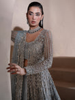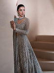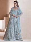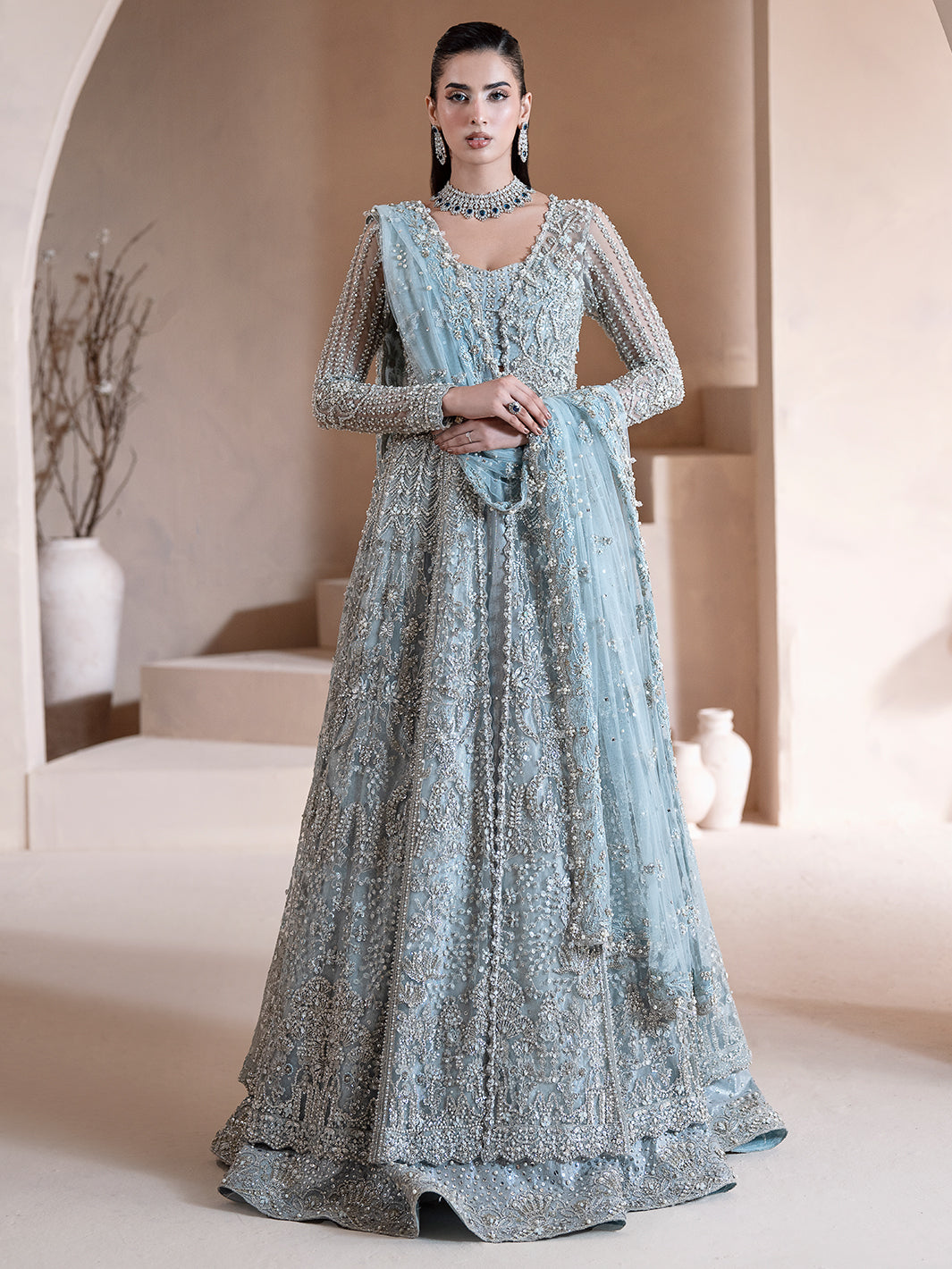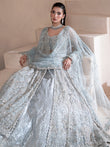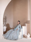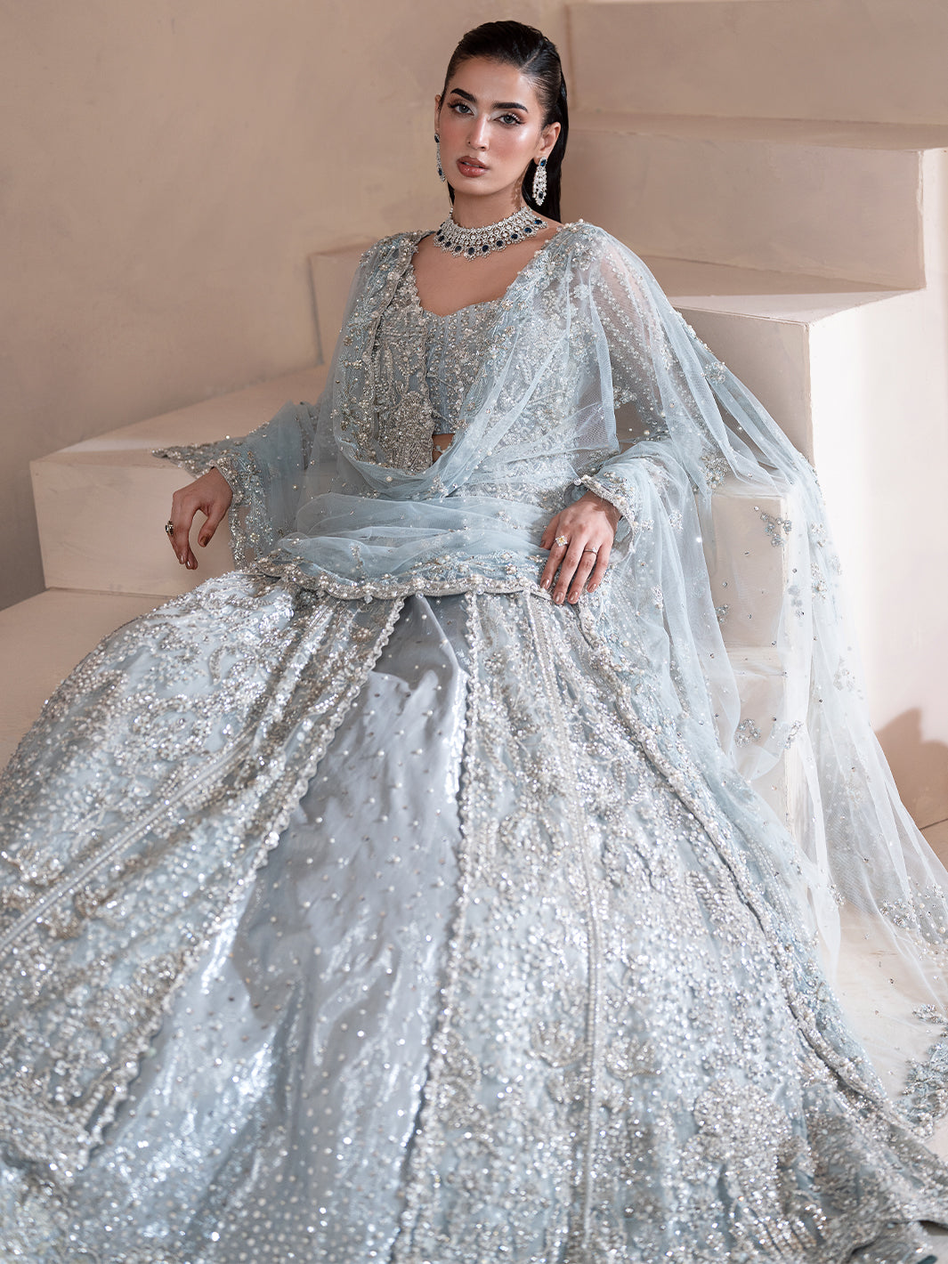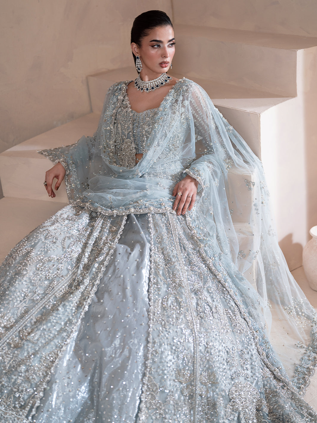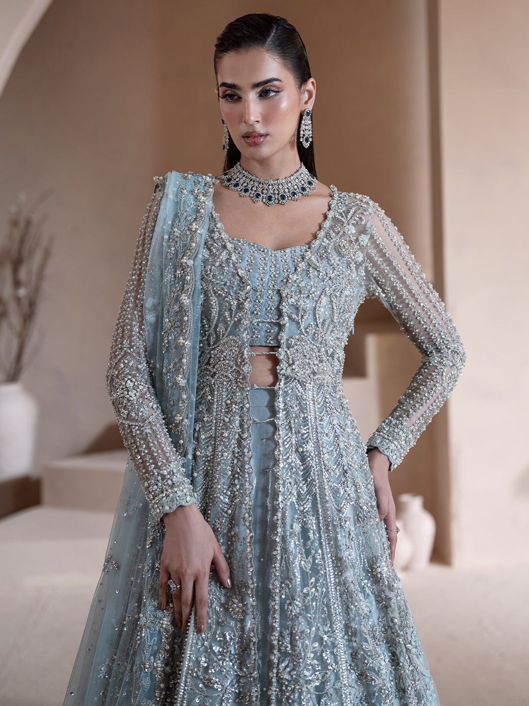 Ornée ethereal in light mint blue captures the poetry of opulence and restraint. Its front-open gown, lavishly embellished, cascades over a refined tube lehnga and diaphanous dupatta. Detailed with thread work, tilla, cut dana, batki, pearls, crystals, and sequins, each element gleams with deliberate precision. Ornée is artistry incarnate a whisper of elegance woven in radiance and grace.