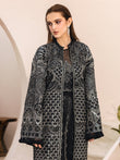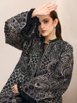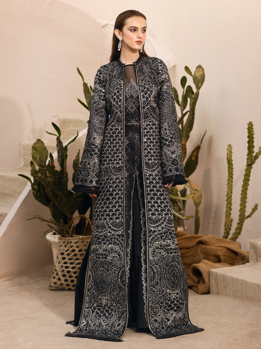 Elevate your style with this exquisite black jacket dress, adorned with shimmering silver hand embellishments that add a touch of elegance and sophistication. Paired with a net blouse that boasts an excruciatingly detailed silhouette, this outfit is designed to turn heads. Complementing the look are the long handcrafted pants, meticulously tailored to perfection. This ensemble is a testament to fine craftsmanship and impeccable design, perfect for making a bold fashion statement at any event.